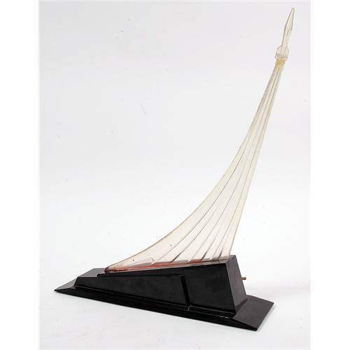 <Our item number 141082><B>Russian Program, Desk Lamp<BR><BR><BR>Russian Program, Desk Lamp.</B> (12x3.5x15") A clear lucite desk lamp showing a rocket launching. When plugged in, the distance between the rocket and the "ground" shows red similating the launch flames. The black base is marked "Cosmos" on the bottom. Minor faults should not detract. Unusual and interesting. <BR>Estimated Value $150 - 250. <BR><BR>Our item number 141082<BR><IMAGES><P ALIGN="CENTER"><IMG SRC="http://www.goldbergcoins.net/liveauction/49jpegs/141082.jpg"> </P></IMAGES>