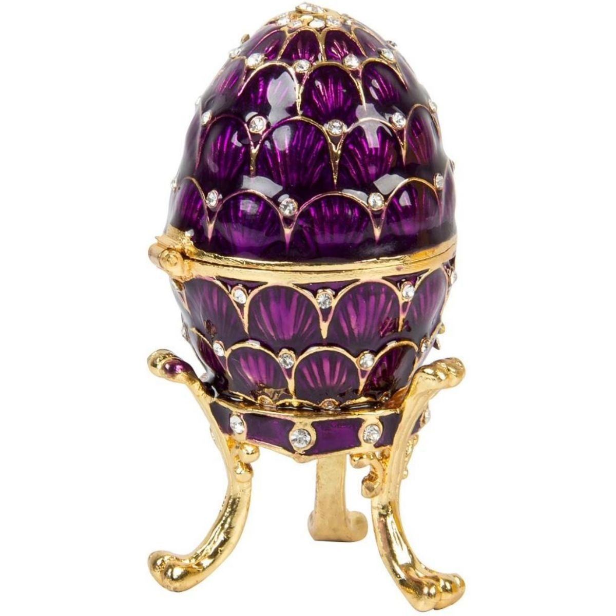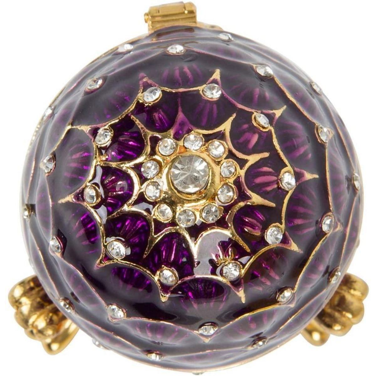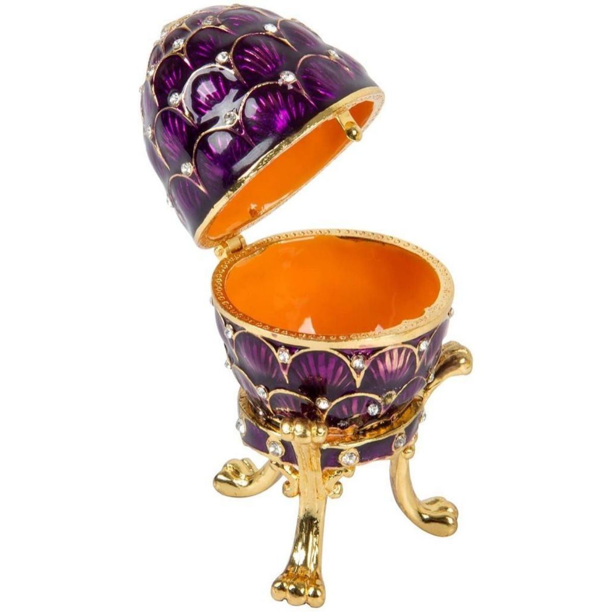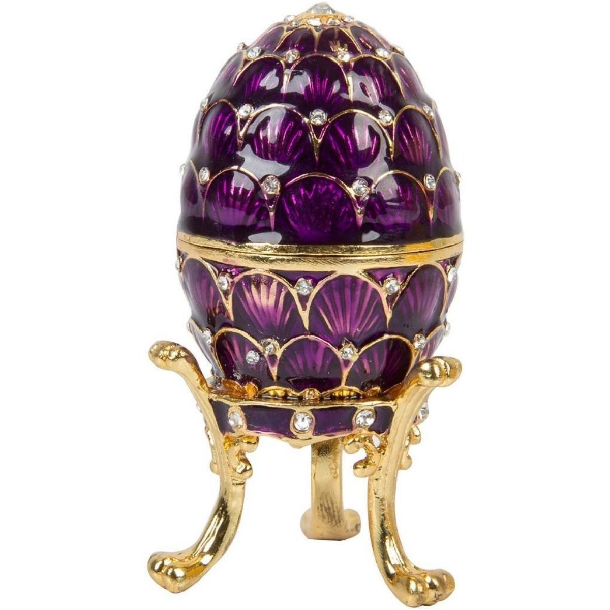 Hand-painted Russian enamel & gilt over pewter, acorn-style, tri-footed, trinket, jewel box egg with embedded Austrian crystals. The top of the egg lifts up on a hinge to reveal an enameled interior for storing trinkets or jewels. 3 1/4" H X 1 1/2" D.Â