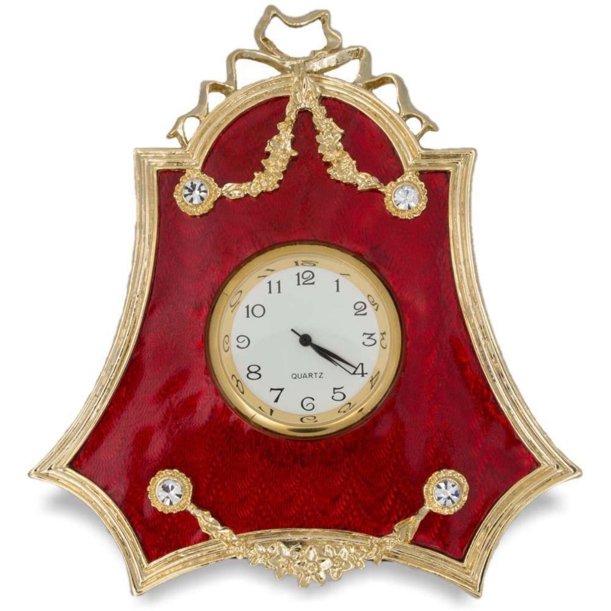 Russian hand-painted red enameled guilloche desk clock. Enamel & gilt over pewter, with ribbon ties & Austrian crystal set laurel garlands. The frame's edges are covered with golden chased laurel border. Removable quartz clock at center. 4'' H.Â