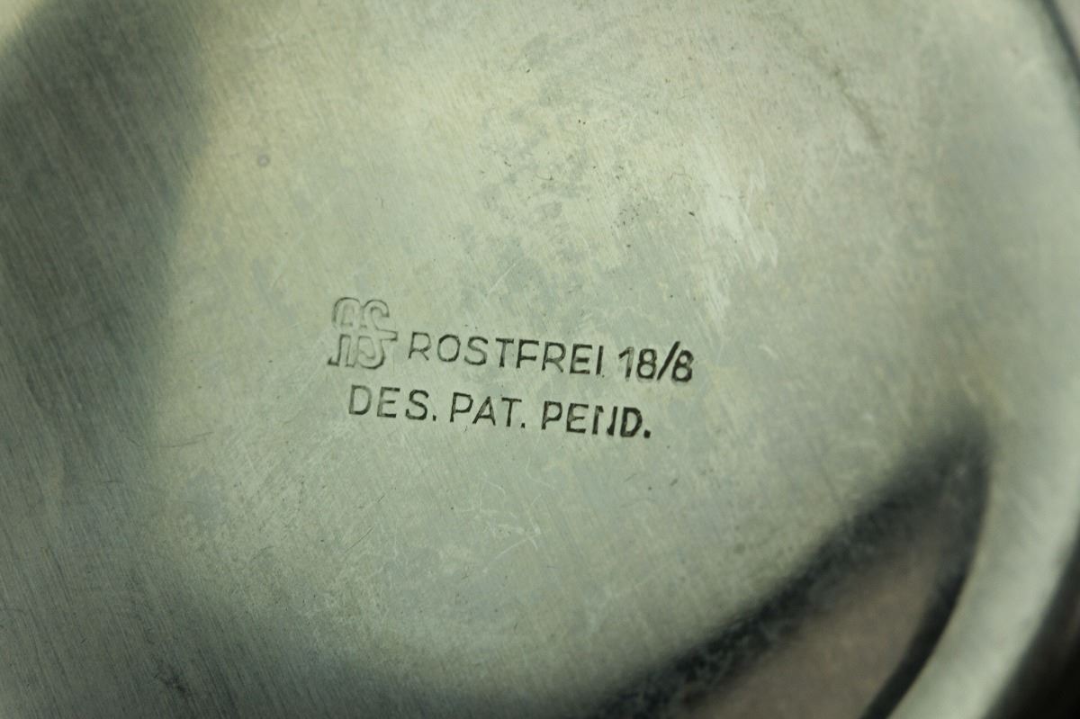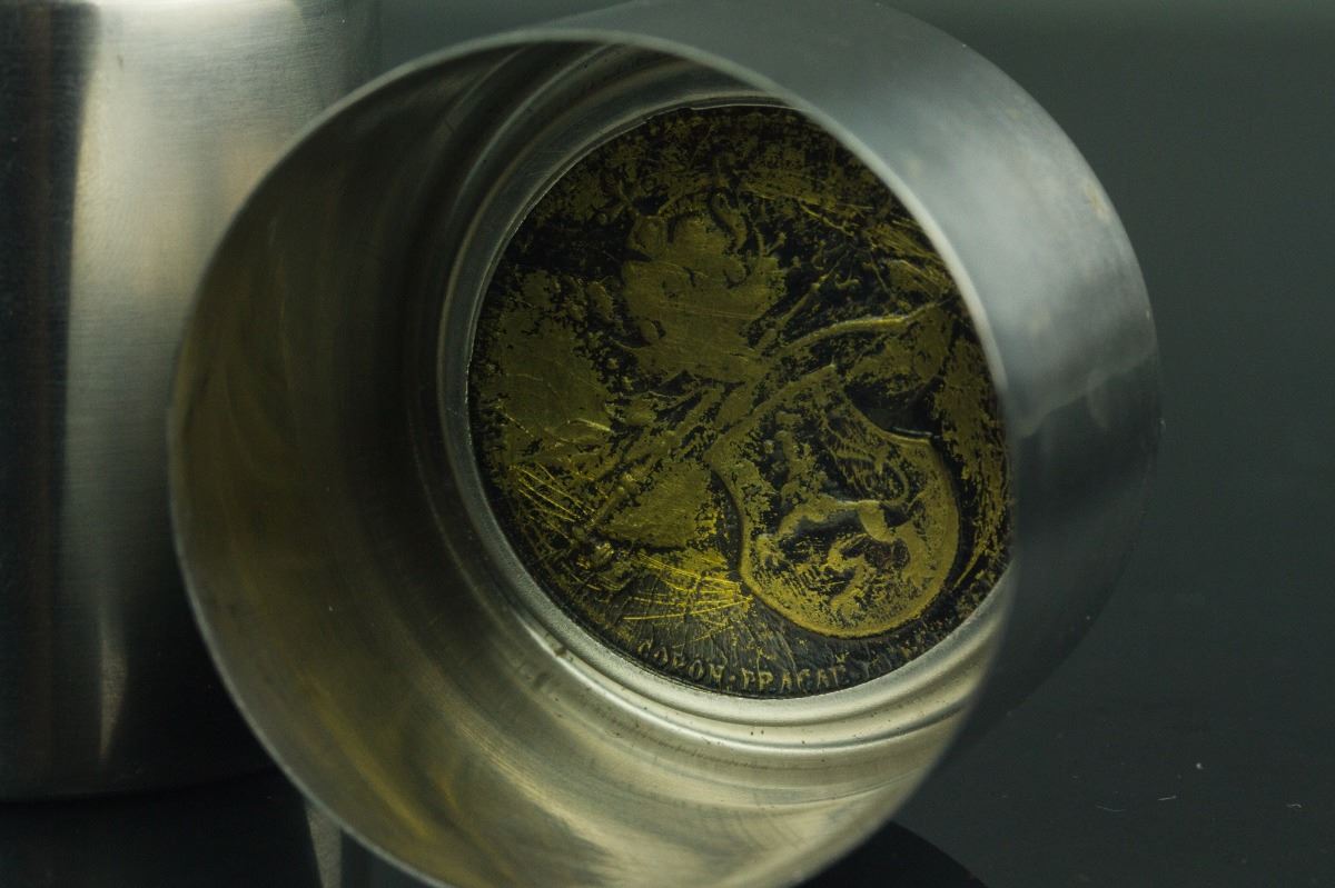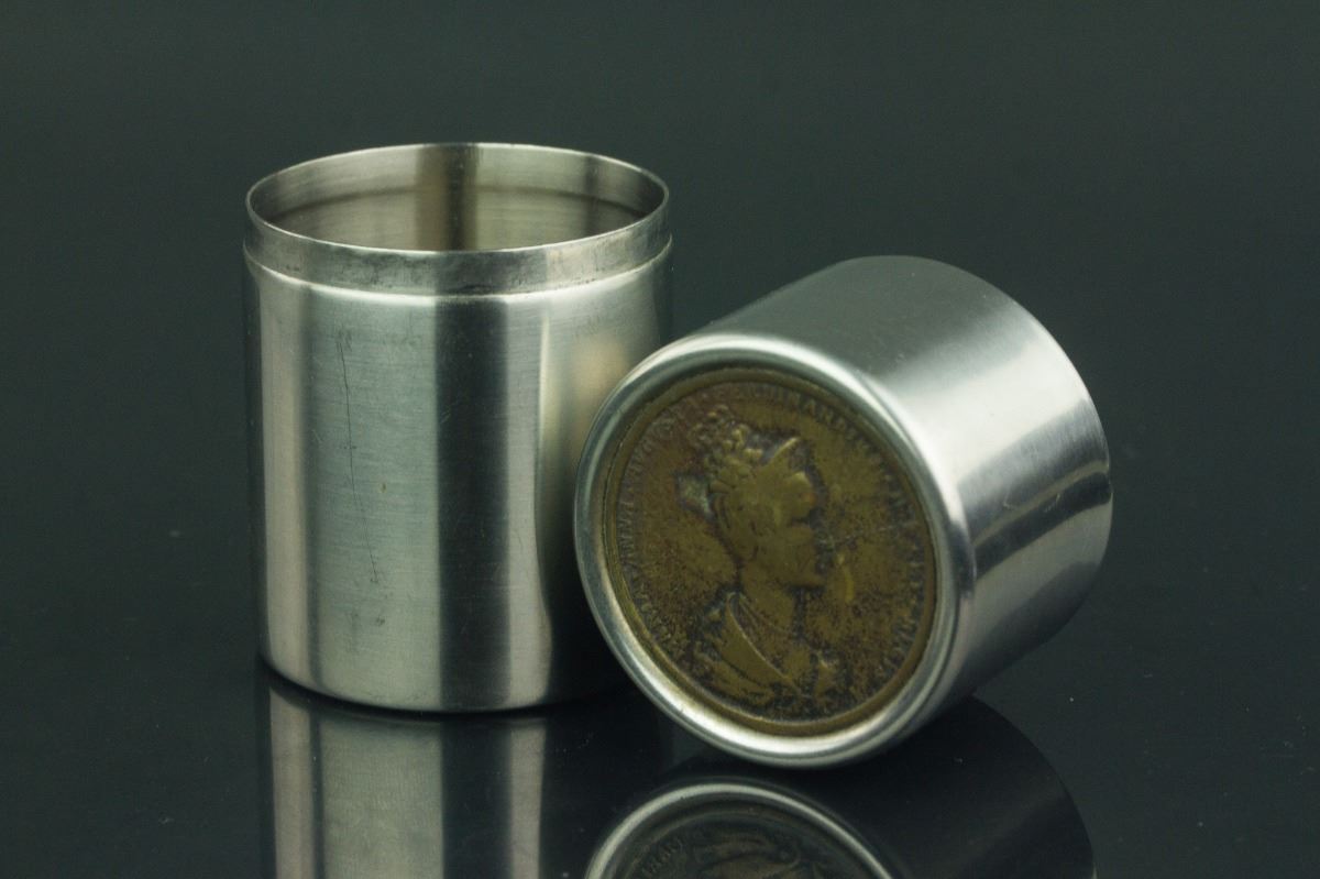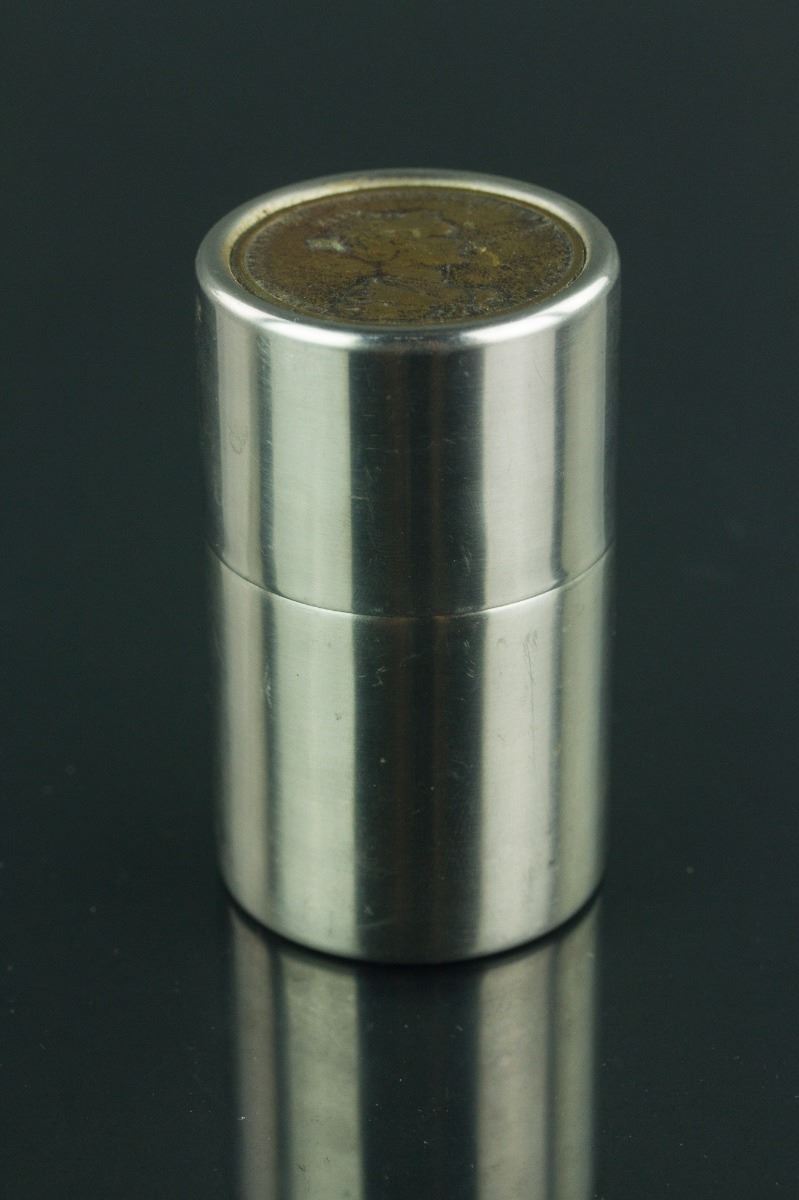 Russian round silver case with bronze coin lid; bottom with mark "AS ROSTFREI 18/8 DES. PAT. PEND.'; H: 9cm, D: 5.5 cm, 142 grams
