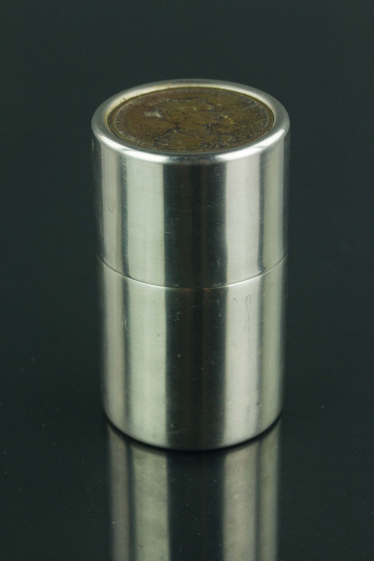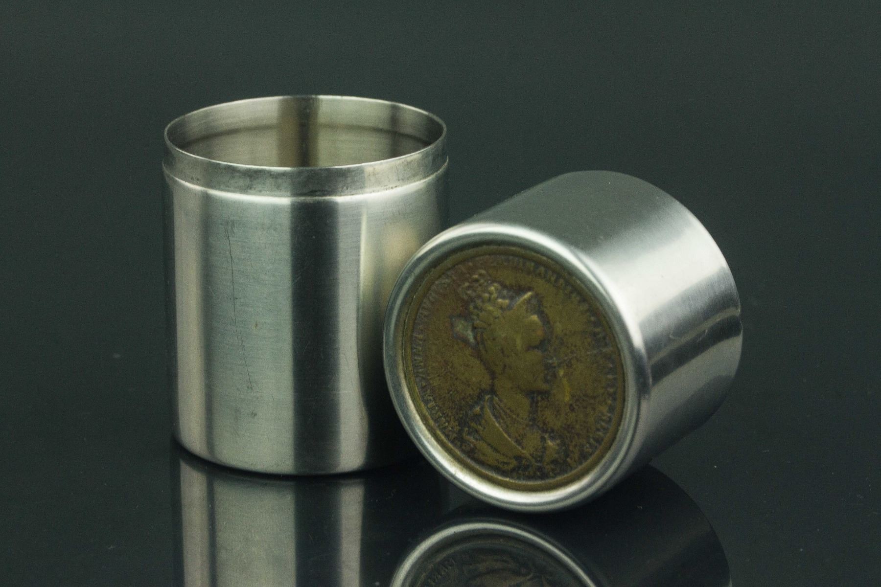 Russian round silver case with bronze coin lid; bottom with mark "AS ROSTFREI 18/8 DES. PAT. PEND.'; H: 9cm, D: 5.5 cm, 142 grams. PROVENANCE: Private collection (Nagoya, Japan)