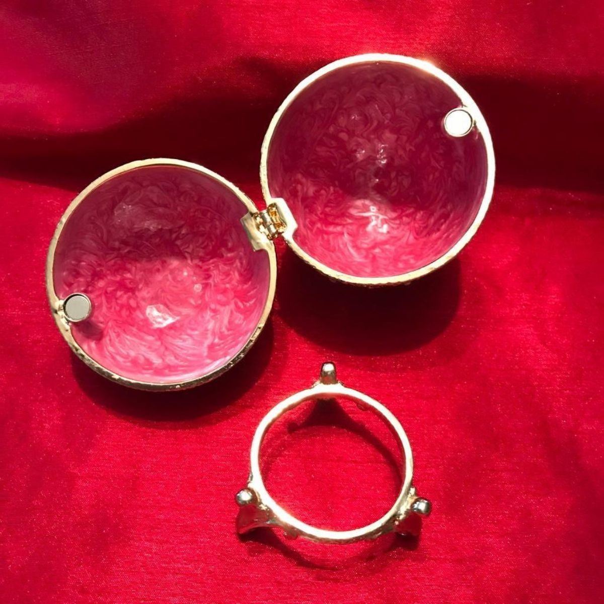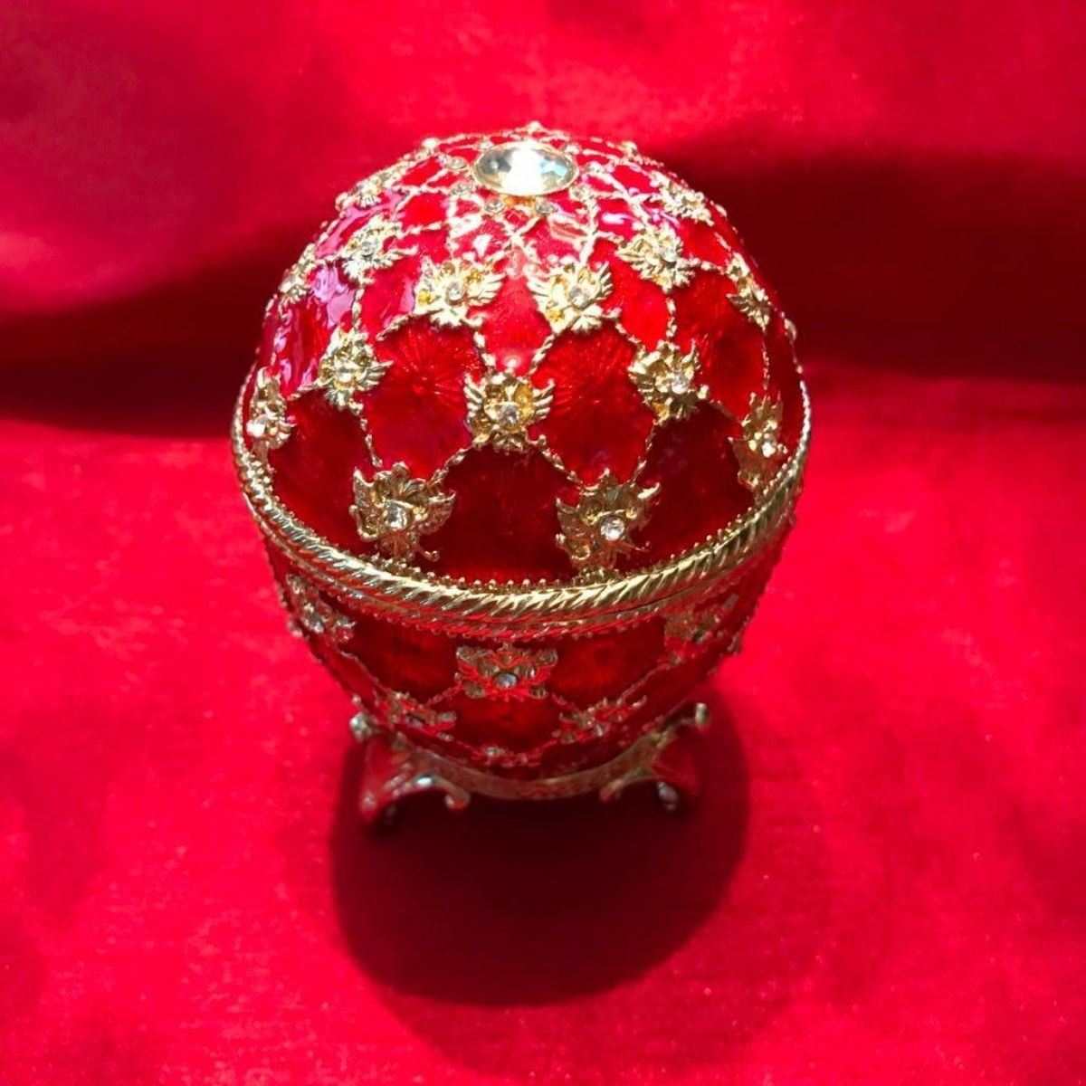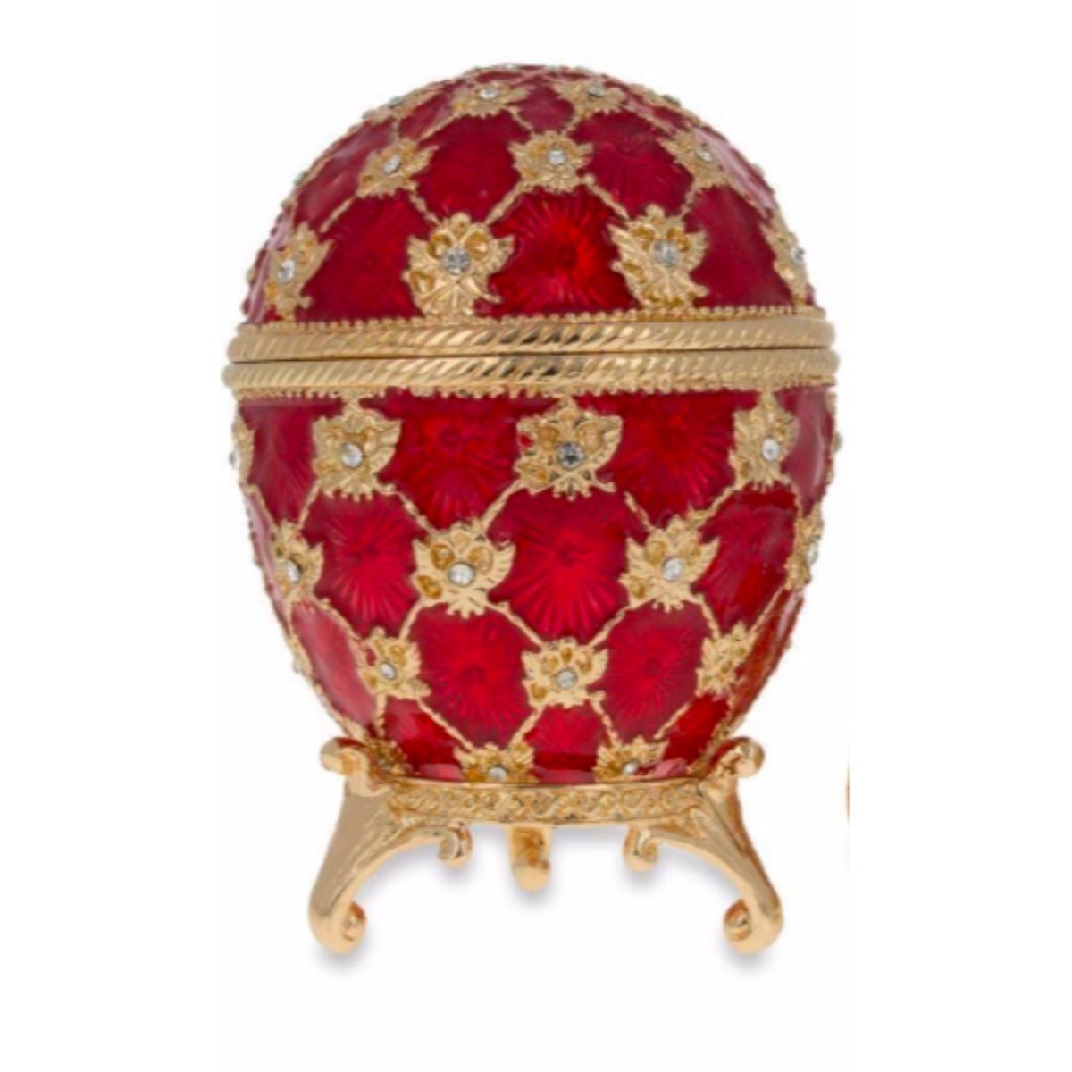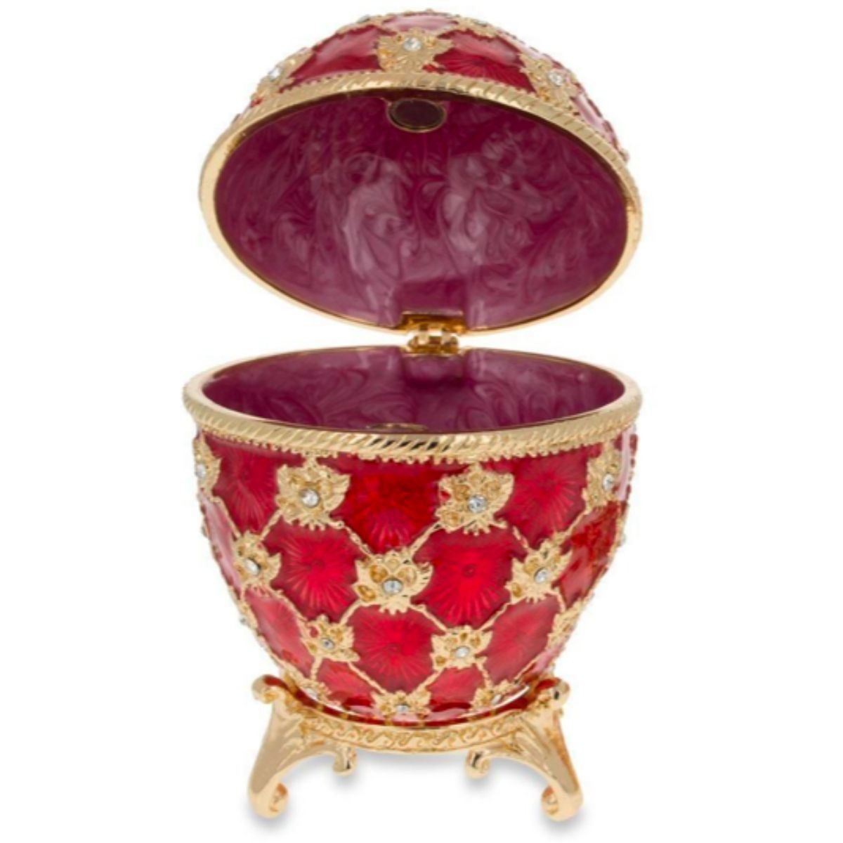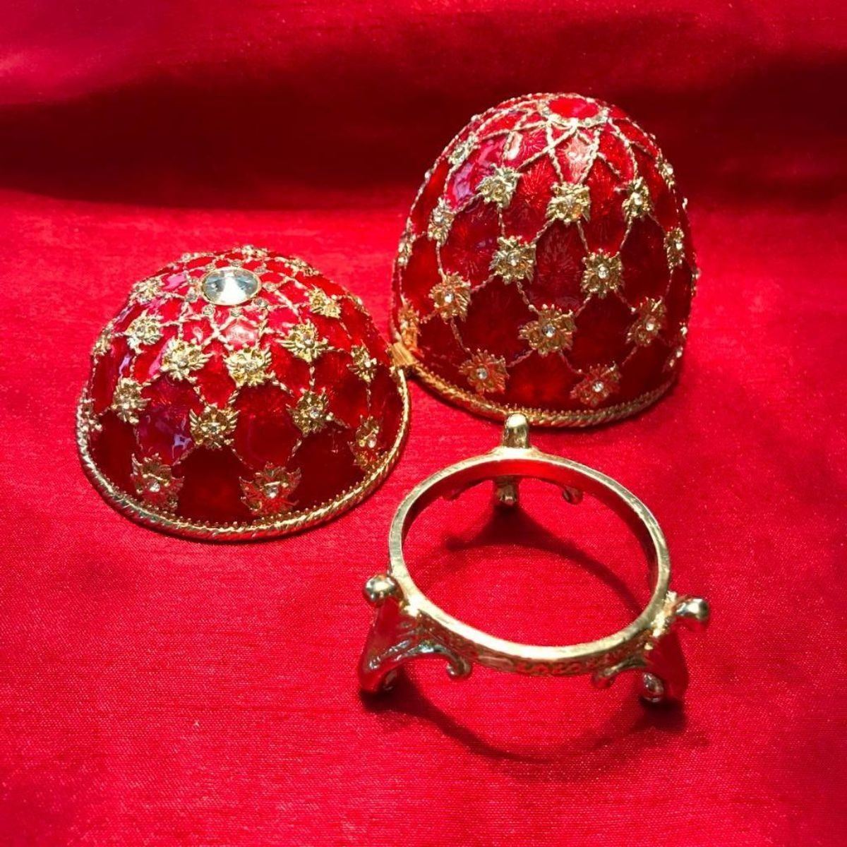Russian Royal Coronation trinket, jewel box, egg. Ruby guilloche enamel & gold gilt over pewter, with embedded Austrian crystals, the egg opens from the center on a hinge to reveal an enameled interior for storing trinkets or jewels, with magnetic closure & matched gilt stand. 3 1/4" H X 2 1/2"W.Â