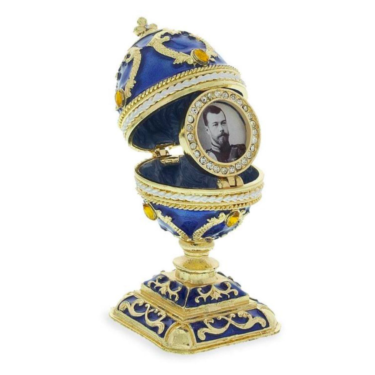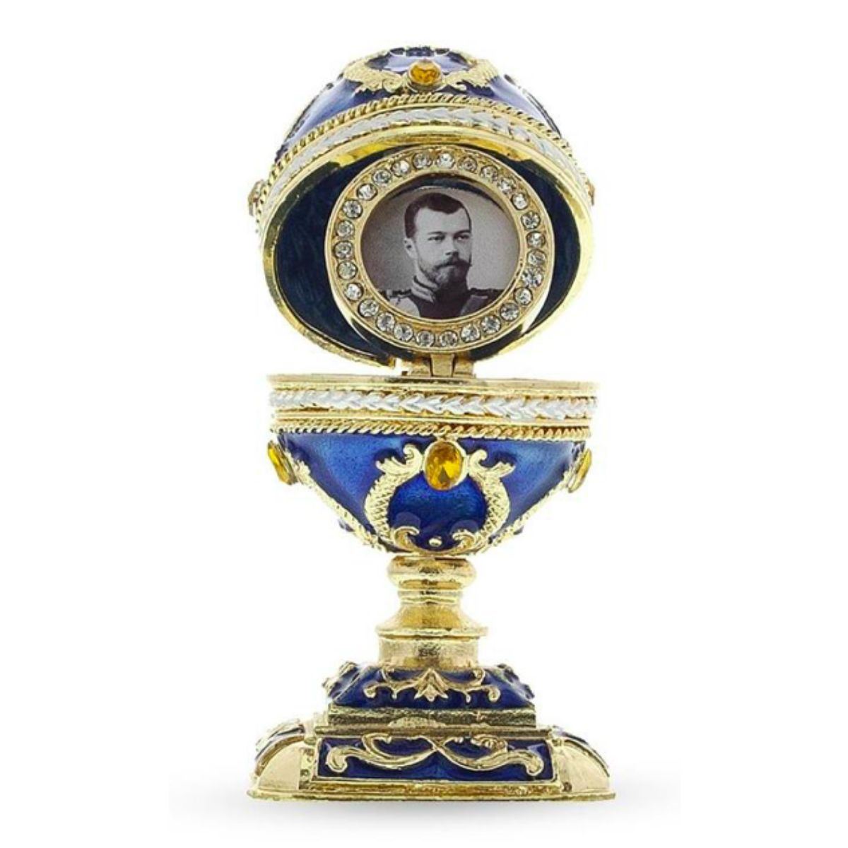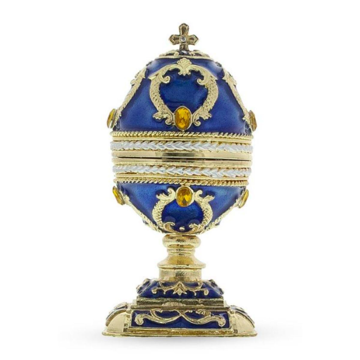 Russian Royal Cross egg, inspired by the original designs of Carl Faberge for the Russian Royal Family. Enamel & gold gilt over pewter with embedded Austrian crystals. The egg opens on a hinge at center & closes with magnets. A tiny jeweled frame for photos flips out of an enameled interior for storing trinkets or jewels. 3 1/2" H X 2" W. Comes with gift box.Â