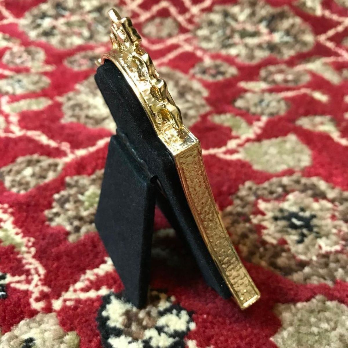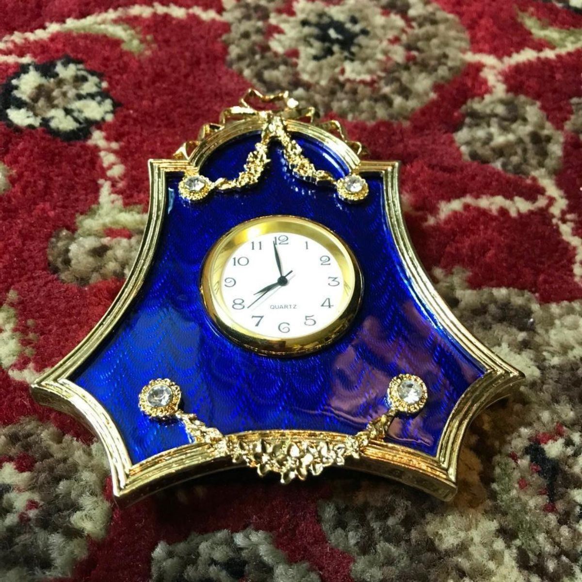 Russian Faberge-style Royal Blue clock. Royal blue guilloche enamel & gold gilt over pewter with inset Austrian crystals & small quartz battery clock, standing frame backing. 4" H.Â