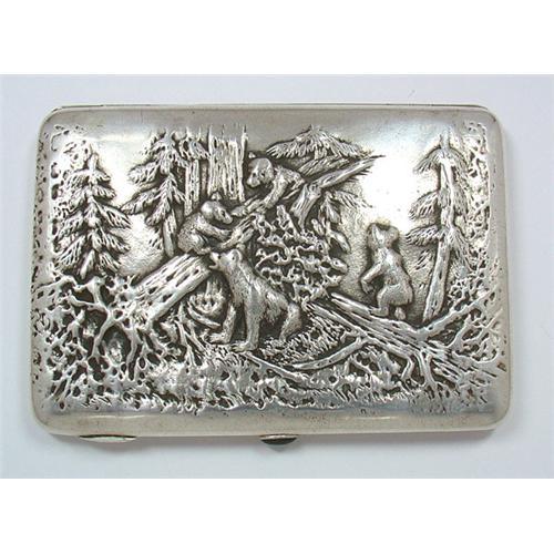 Pre-Revolutionary Russian cigarette case. The front depicts a woodland forest scene of bear with 3 cubs cavorting among pine trees. Most of the gold wash in the interior has been worn off. A cabochon green stone appears at the closure. On both inner sides there is a hallmark of St. Petersburg, dating from 1908-1917, depicting the profile of a right-facing woman wearing a kokoshnik and the number 84, indicating a silver fineness of .875. There is also a PP mark in cyrillic. Minor superficial abrasion is within the realm of normal wear. 4.25"(10.8cm)L, 3"(7.6cm)W, 0.5"(1.3cm)D. 6 oz. (170g)