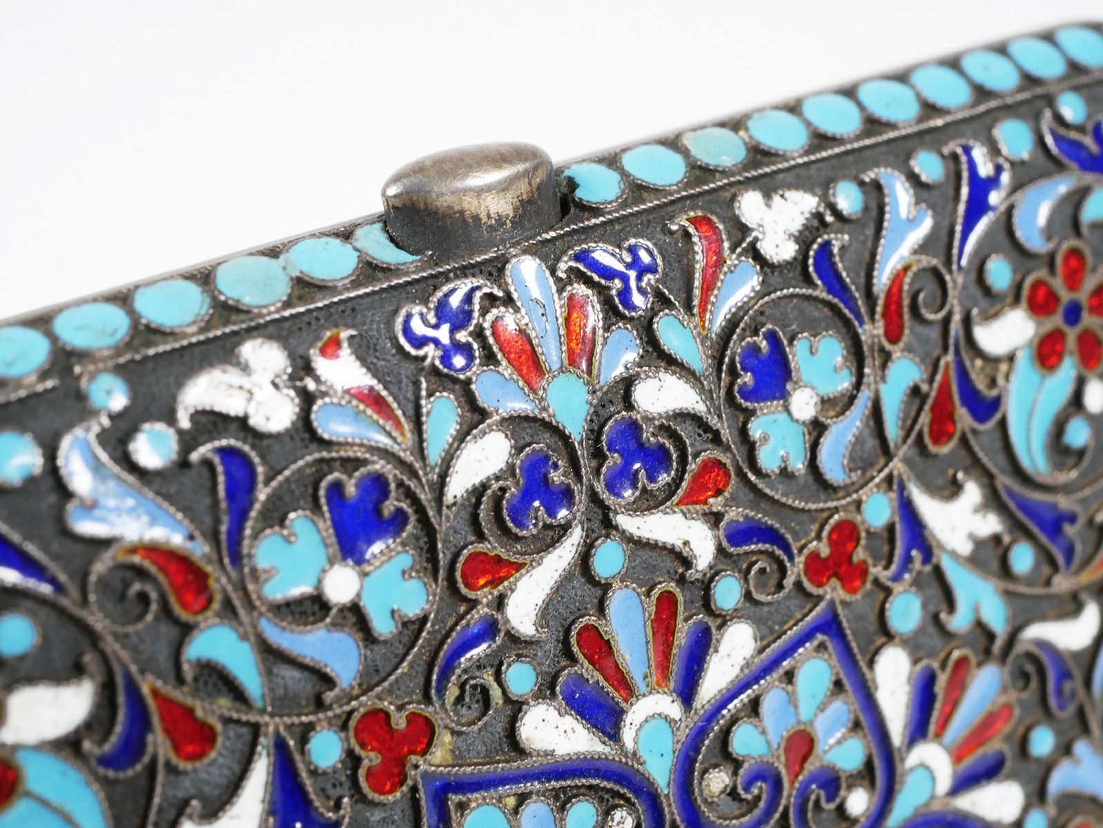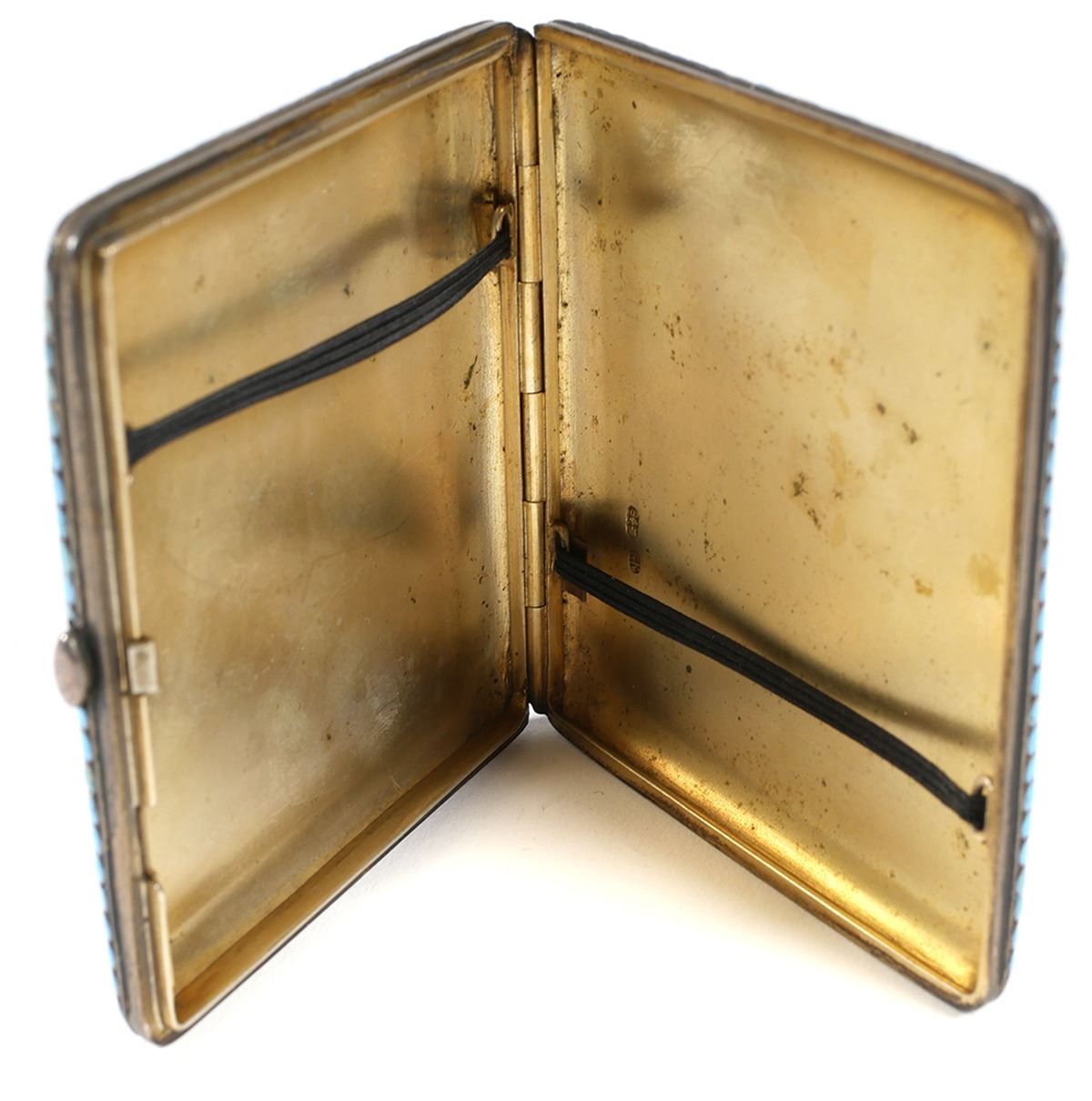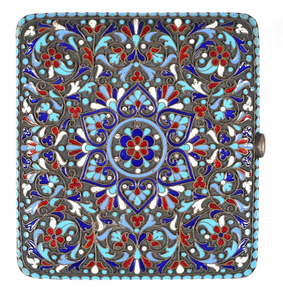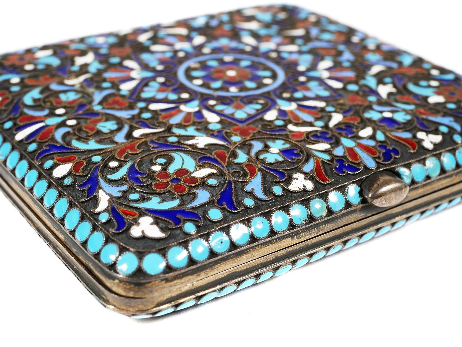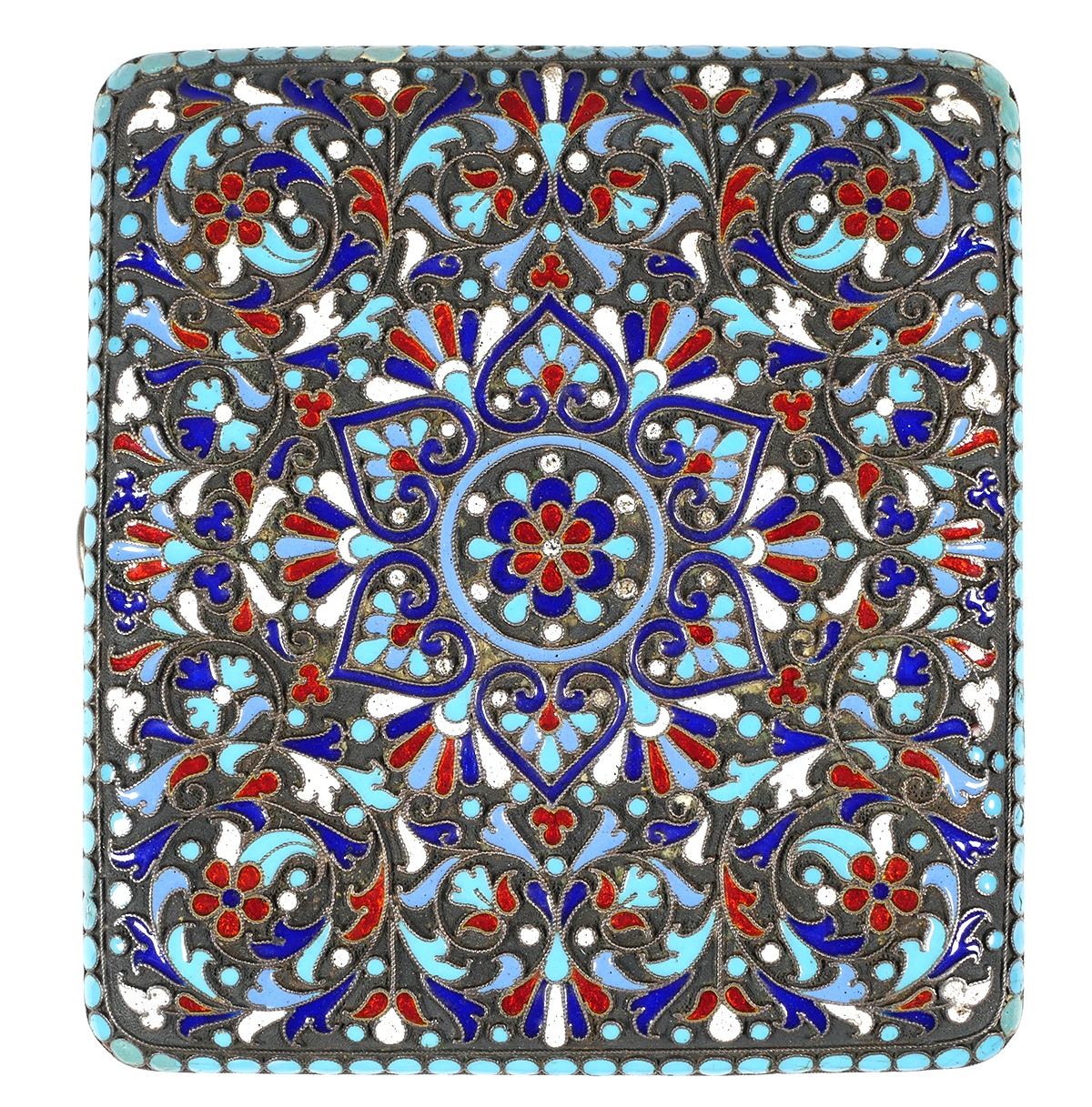 Circa 1890-1900 Russian 84 zolotnik (.875) gilt silver cloisonne cigarette case each side bearing the mark of Moscow silversmith Gustav Klingert. Measures about 3-3/8" x 3-1/8". Very fine condition, minimal wear. Closes securely and flush.