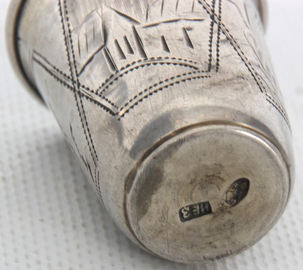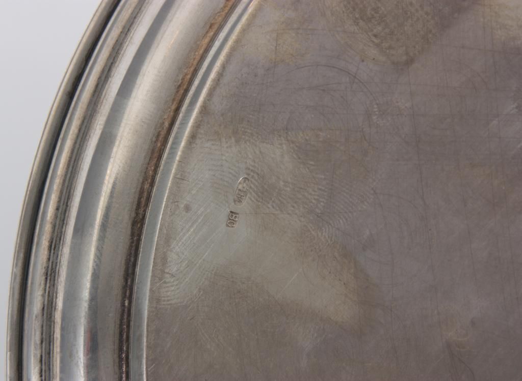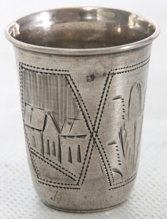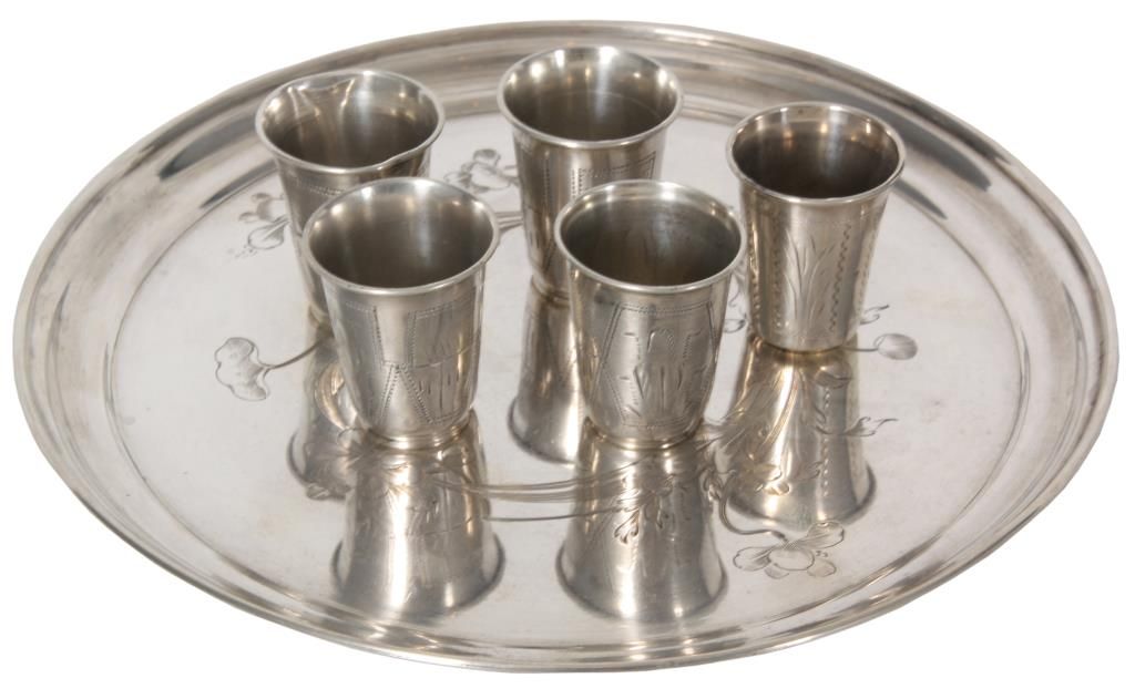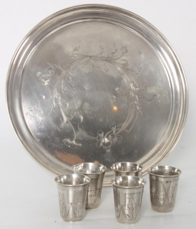 Russian Silver Tray & Cups. 8 in. dia. round tray has a floral and filigree design in the center, hallmarked with 84 zo. kokoshnik mark (.875 silver) and BC makers mark; 4 matching cups have a conical form with engraved design, signed with 84 zol. kokoshnik mark (.875 silver) and Israel Eseevich Zakhoder makers mark. The fifth cup is very similar to the others and is marked with Czechoslovakian .800 silver hallmarks. Total weight 9.9 oz.