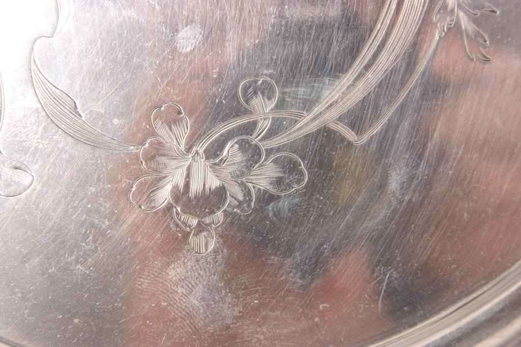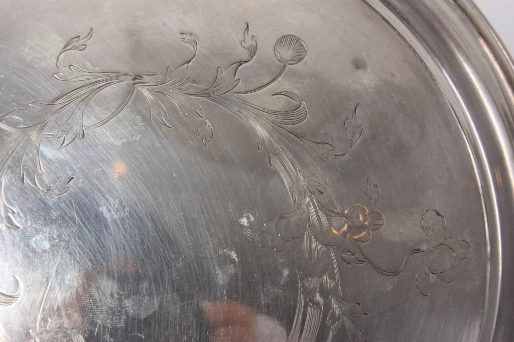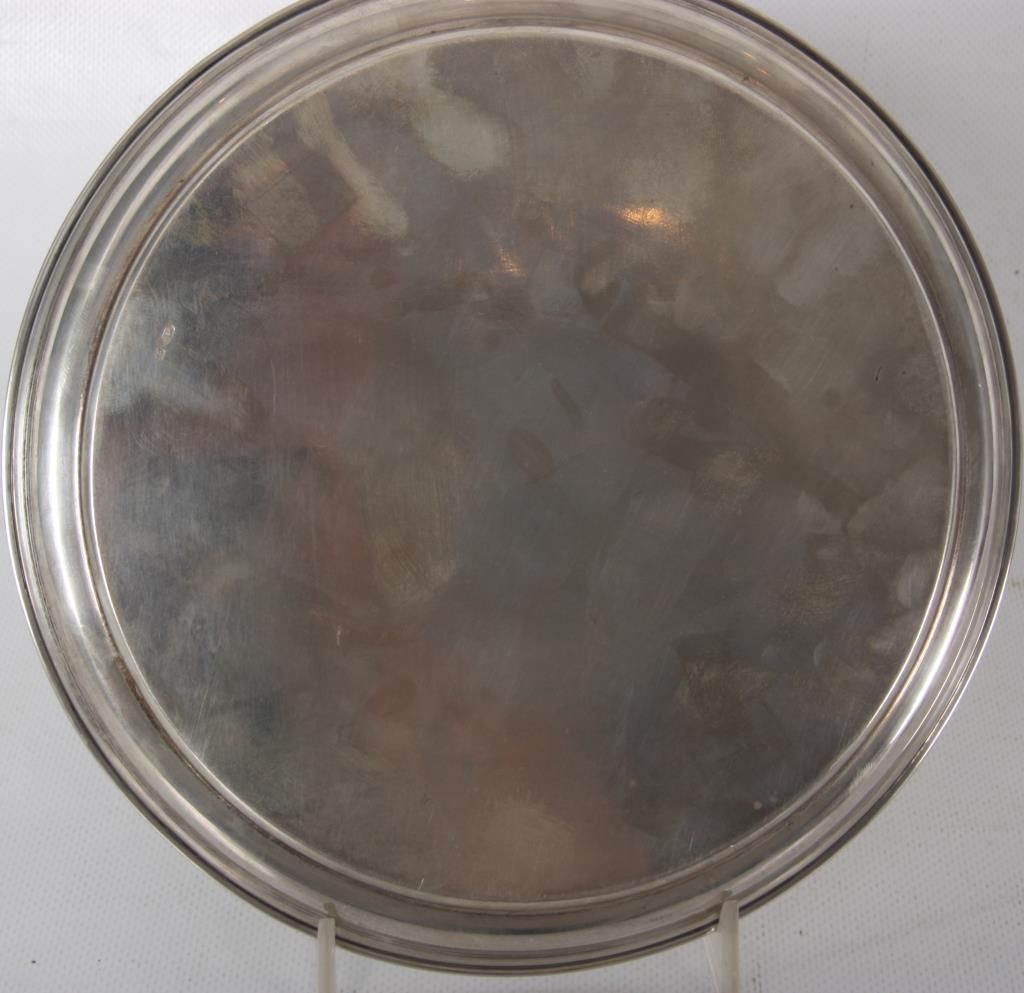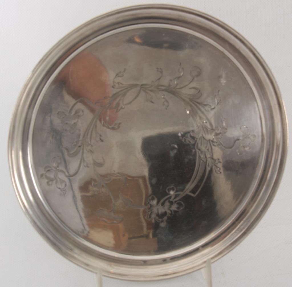 Russian Silver Tray & Cups. 8 in. dia. round tray has a floral and filigree design in the center, hallmarked with 84 zo. kokoshnik mark (.875 silver) and BC makers mark; 4 matching cups have a conical form with engraved design, signed with 84 zol. kokoshnik mark (.875 silver) and Israel Eseevich Zakhoder makers mark. The fifth cup is very similar to the others and is marked with Czechoslovakian .800 silver hallmarks. Total weight 9.9 oz.