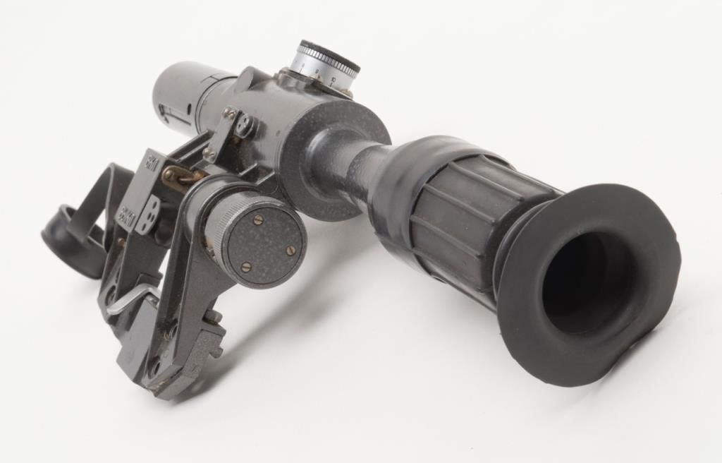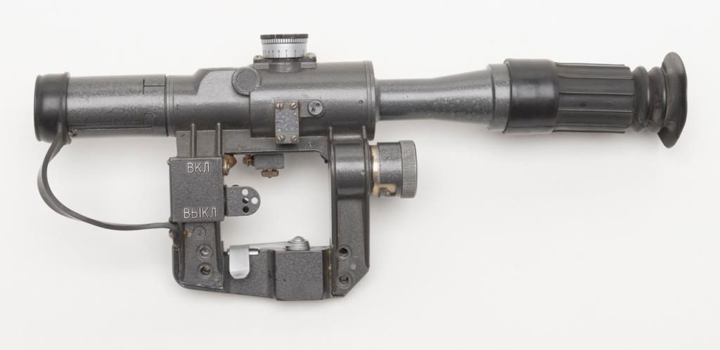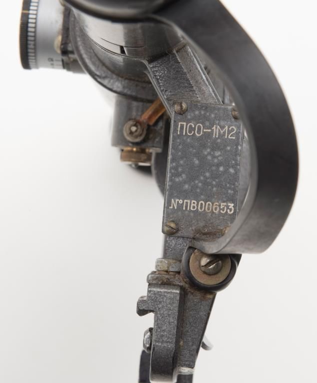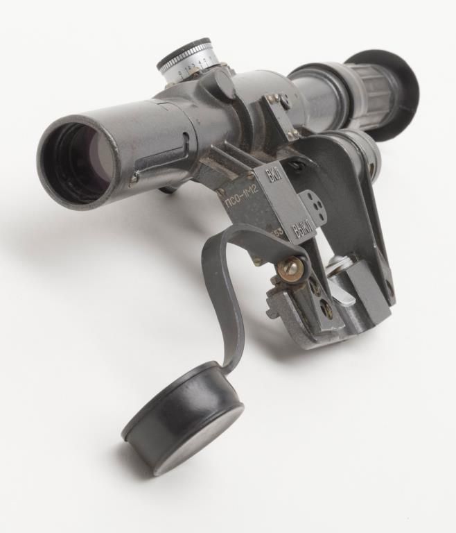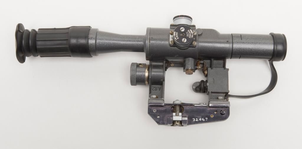 Russian Sniper scope with mounts. The scope features windage and elevation controls along with proprietary side mount. An interesting piece. $150-$300.