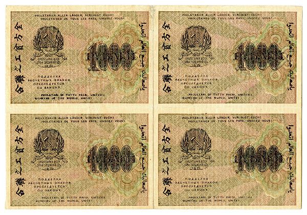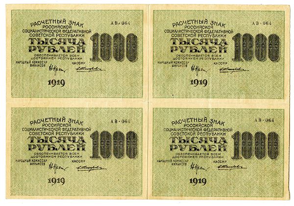 Russia. Uncut partial sheet of 4, 1000 Ruble currency notes. P-104. XF to AU condition.