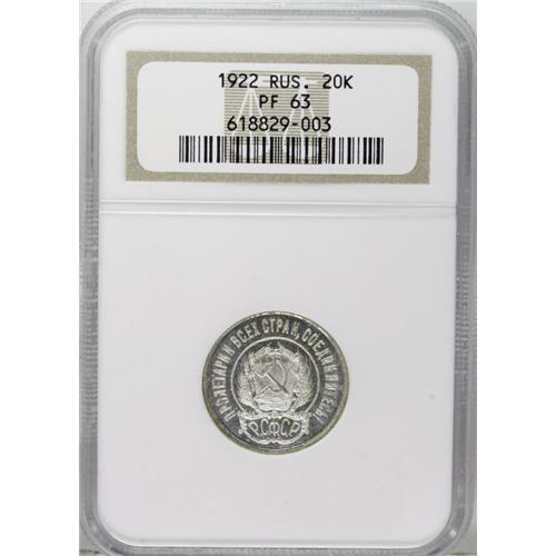 <B>Russian Soviet Federated Socialist Republic Proof 20 Kopecks 1922,</B></I> KM-Y82, Proof 63 NGC. Nicely mirrored fields with light abrasions.<BR><BR><b>Shipping:</b> Coin/Currency (<a target="_blank" href="http://www.heritageauctions.com/common/shipping.php">view shipping information</a>)