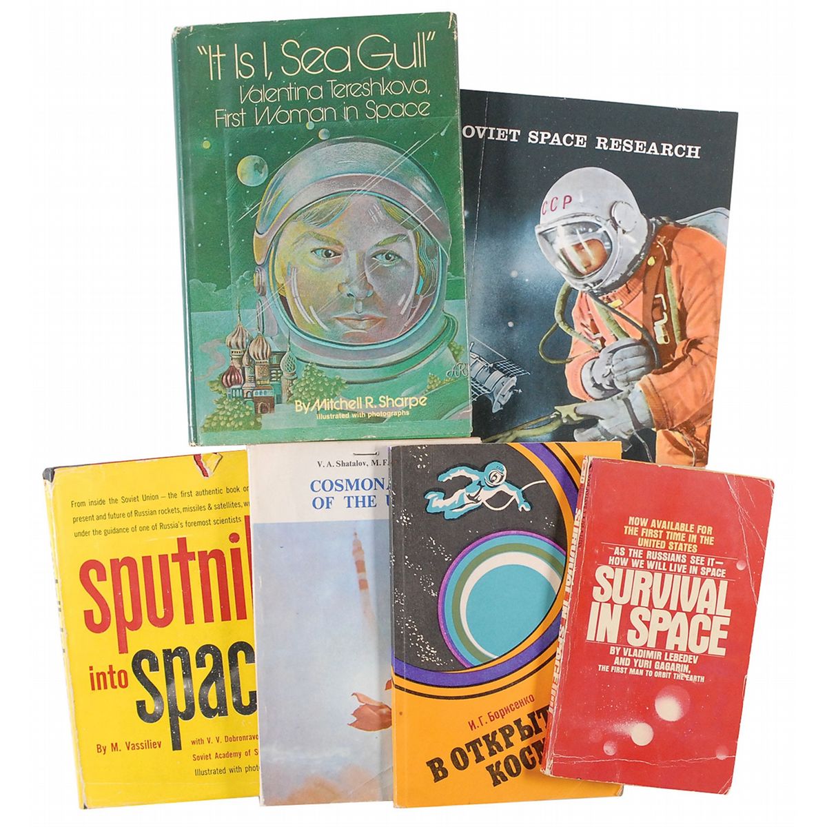Collection of six Russian space books, both hard and softcover. Titles are: It Is I, Sea Gull; Soviet Space Research; Sputnik into Space; Cosmonauts of the USSR; Survival in Space; and one Russian title. In overall very good condition.