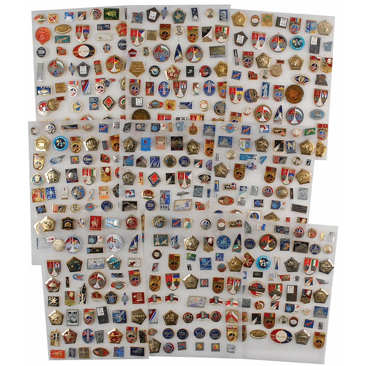 A collection of approximately 450 Soviet commemorative space pins and buttons, various shapes and sizes, commemorating different cosmonauts, missions, or achievements. In overall fine condition.