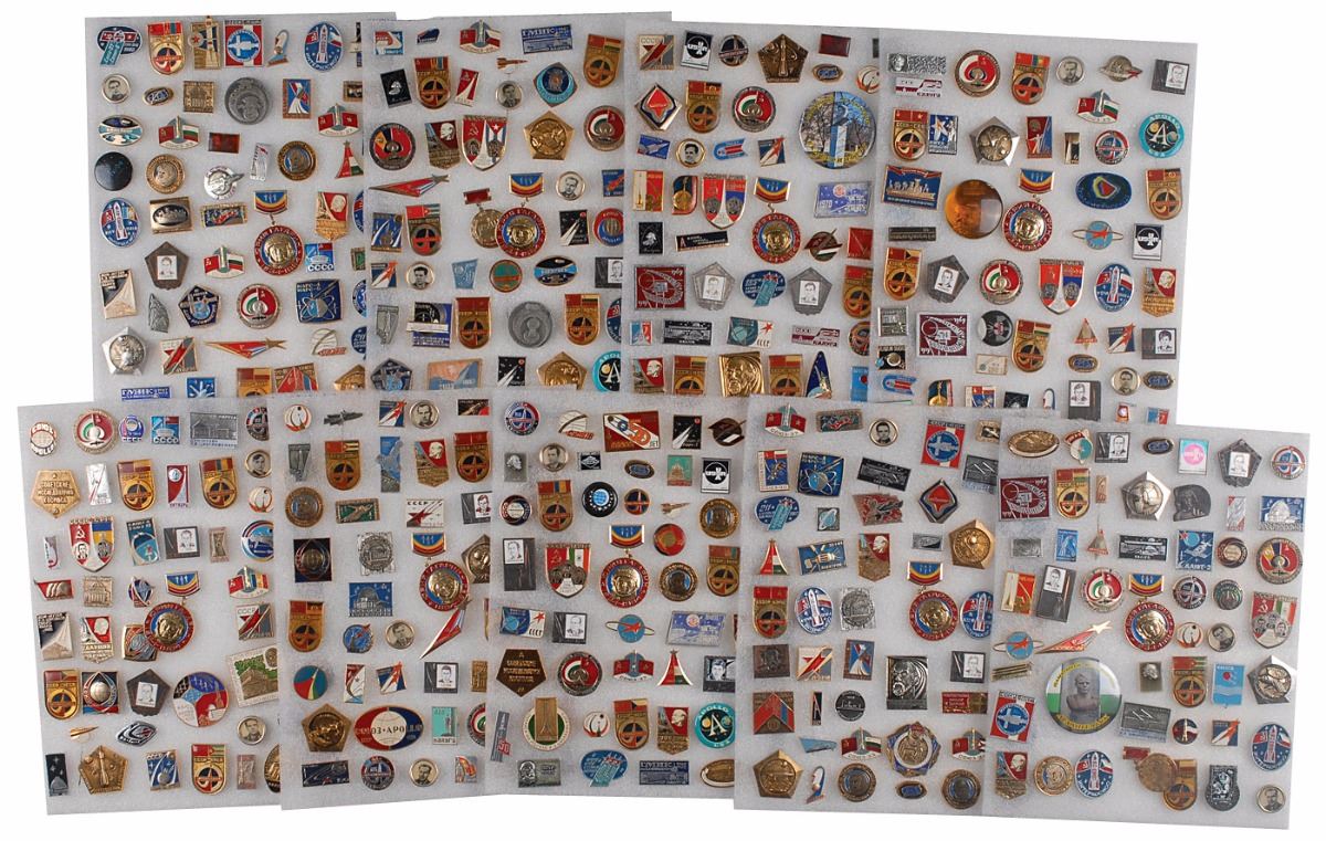 Impressively large collection of approximately 450 Soviet commemorative space pins and buttons, various shapes and sizes, commemorating different cosmonauts, missions, or achievements. In overall fine condition.