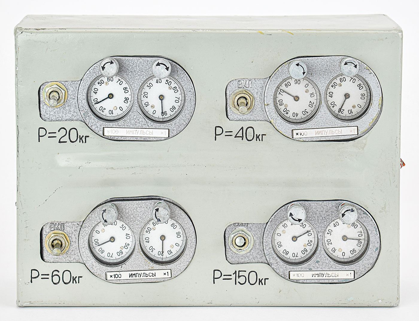 Russian spacecraft propellant metering gauge, possibly associated with the Salyut or Mir space station, measuring 11? x 7.75? x 3.75?, used to monitor the amount of propellant consumed and expended by the propulsion system when fired. In very good to fine condition, with some dents to the metal case.