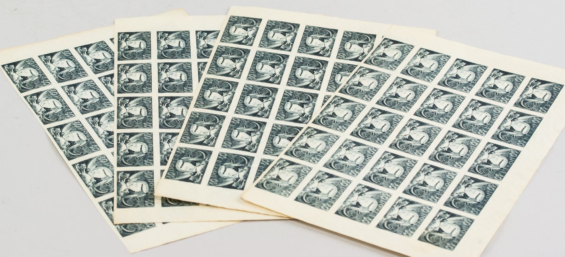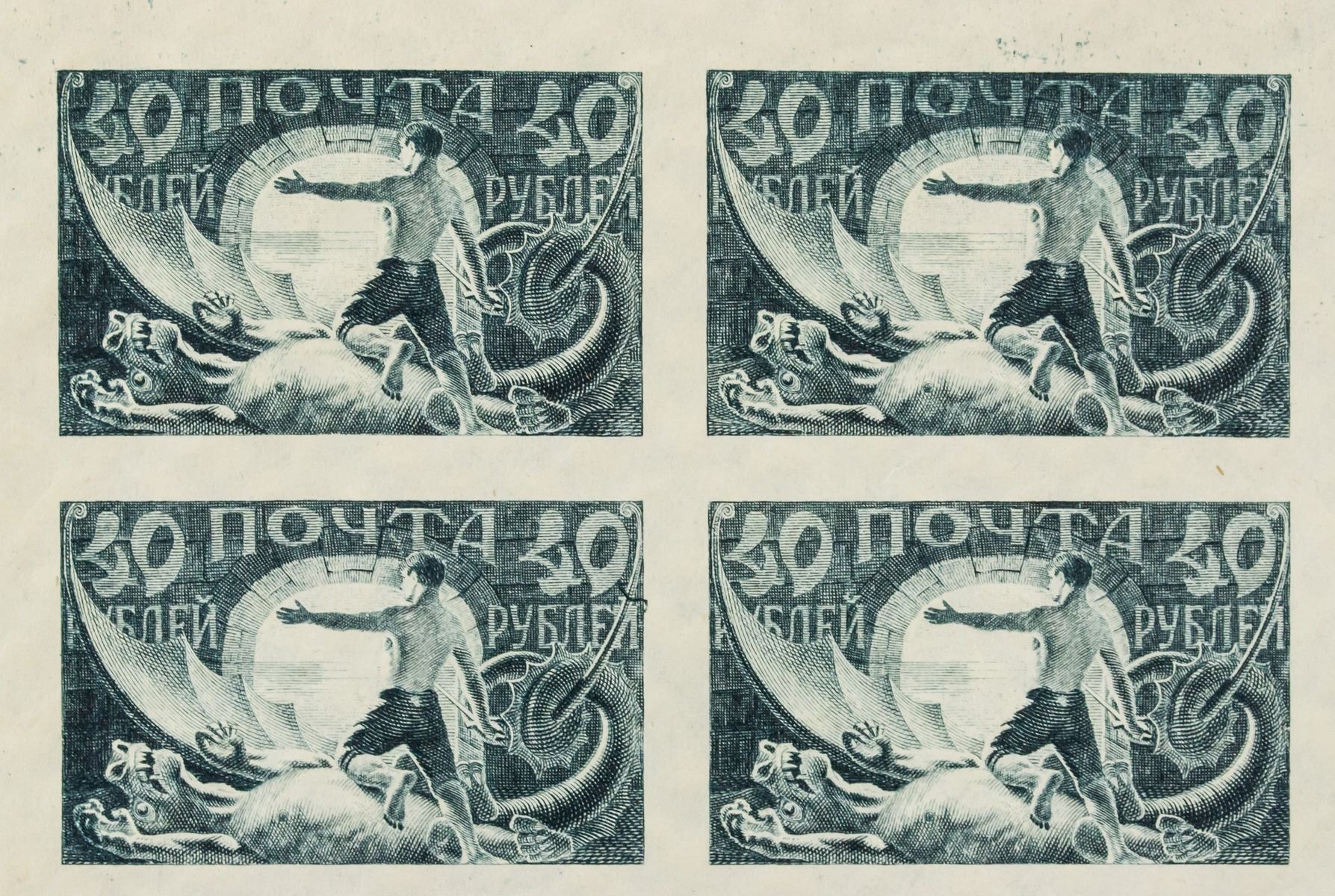 Four sheets of Russian stamps. Featuring a young man holding a sword and kneeling atop of slain dragon. 15 x 24 cm.
