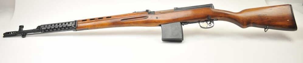 Russian Tokarev SVT-40 semi-automatic rifle, 7.62 x 54R caliber, Serial #91454. The rifle is in fine overall condition with a 26” barrel including the muzzle break. The rifle retains nearly all of the military finishwith numerous Russian proofs and acceptance marks and the front ring is dated 1941. All matching visible serial numbers, except the magazine. The smooth wood stock is in very good condition with dents and mars consistent with service use. The bore is good and the action works well on this WWII era Tokarev. The lot includes one correct magazine. Est.: $700-$1,400. (C+R).