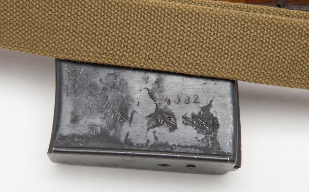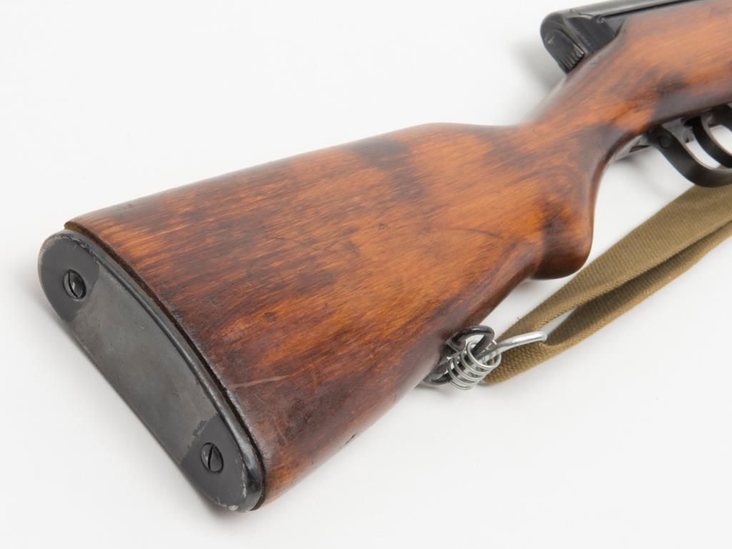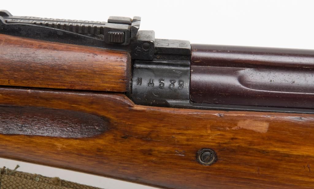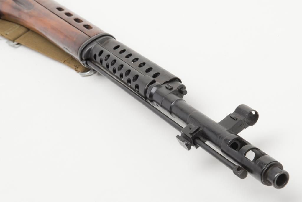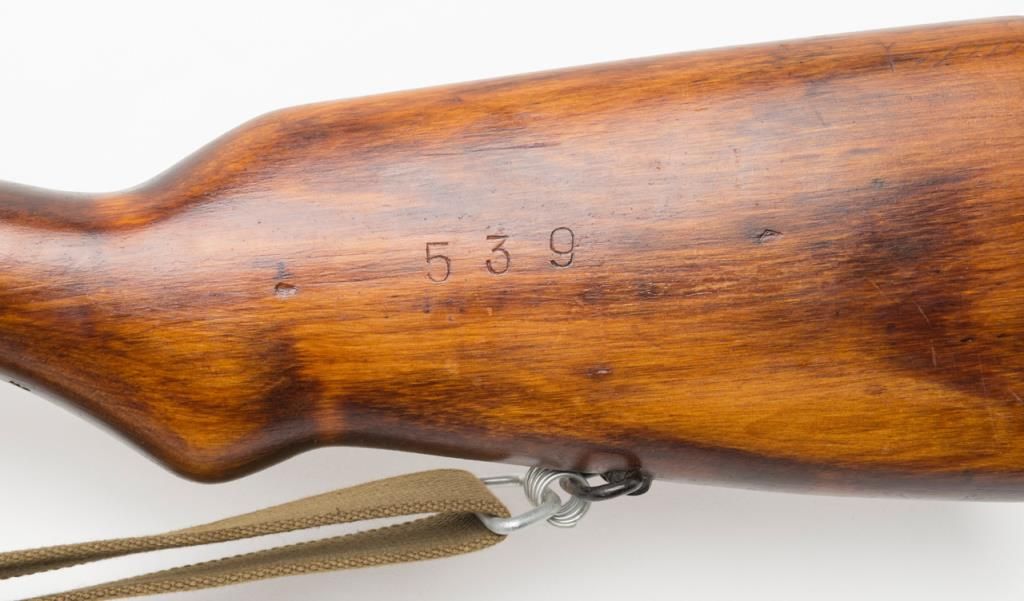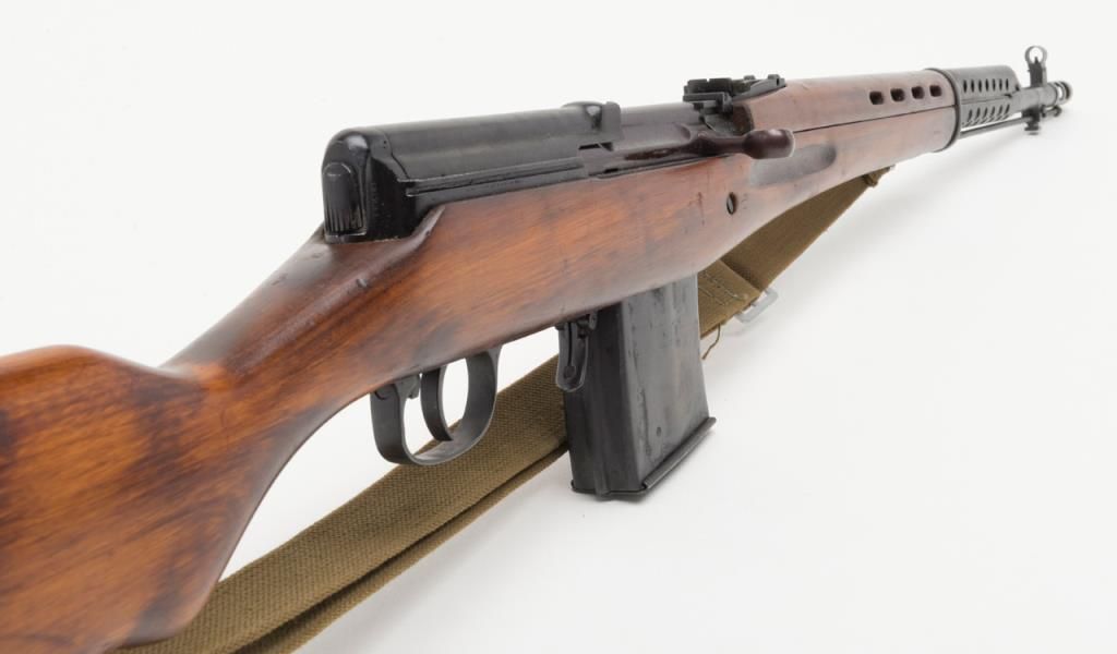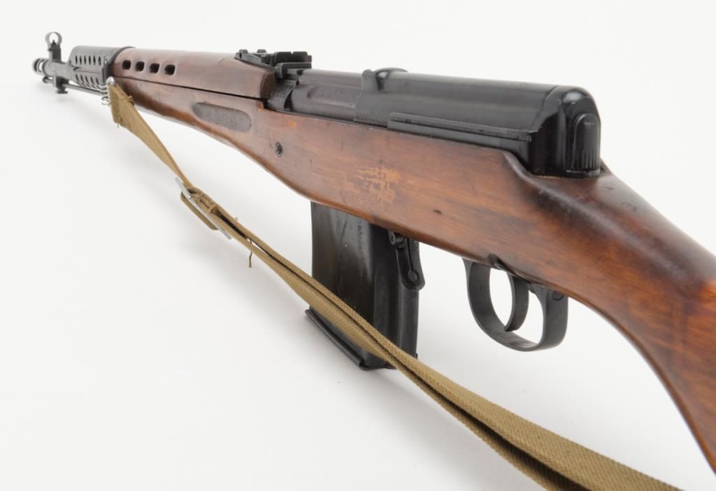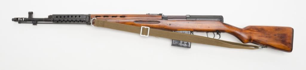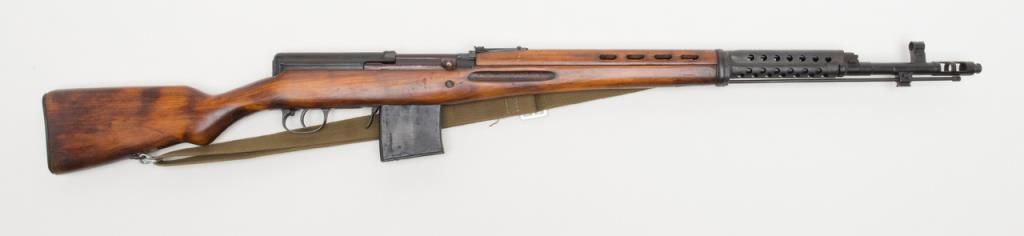 Russian Tokarev SVT-40 semi-automatic rifle, caliber 7.62 x 54, Serial #4539. The rifle is in overall very good condition with a 26” barrel with integral muzzle break. The rifle retains nearly all of its military finish with tangent rearsight, sling swivels, military web sling, correct detachable magazine and smooth metal butt. The smooth wood stocks are in overall very good condition showing storage mars, cartouches and is serialized to the rifle. The bore is very goodplus, action crisp and markings sharp. A fine example of a World War II battle rifle. (C+R/PPT). Est.: $700-$1,400.