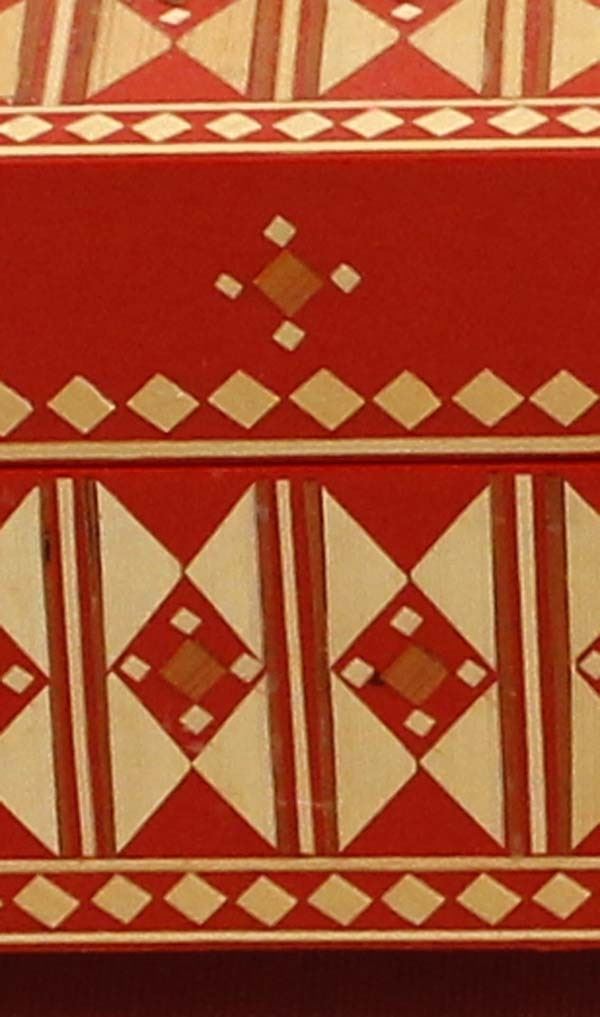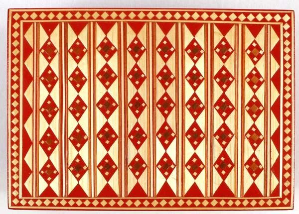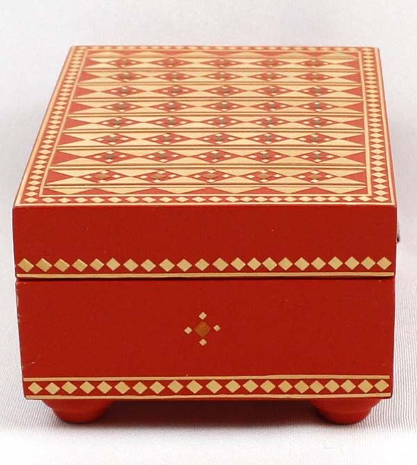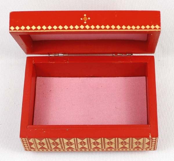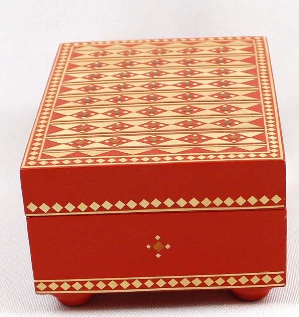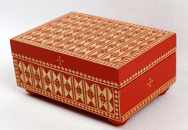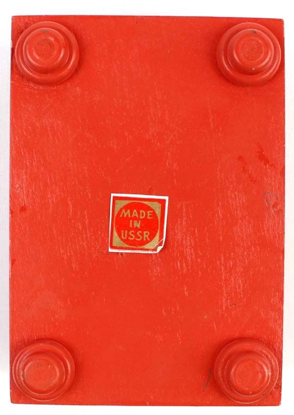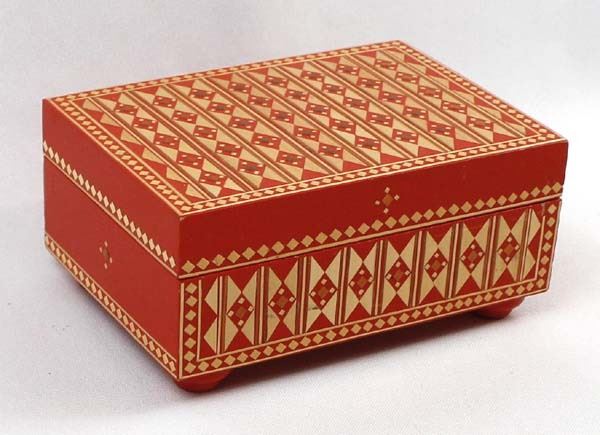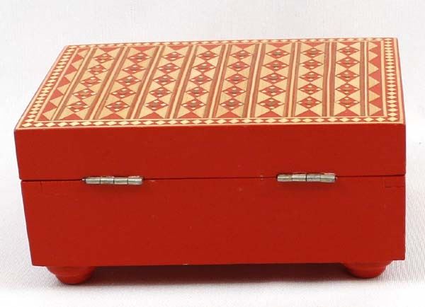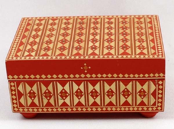 Vintage Russian Wood Trinket Box with Straw Inlay, measures 2.5'' x 4'' x 5'' and has the original paper label on the bottom ''Made in U.S.S.R.''