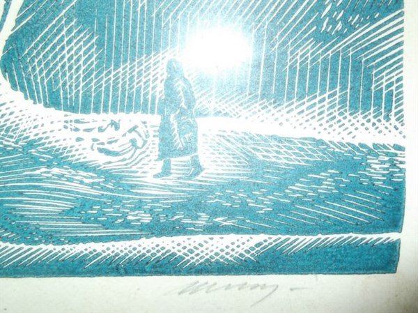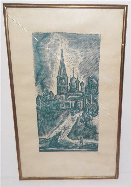 Russian Woodblock Religious building scene signed illeg. Info on back; Glass cracked. 8 1/4 inches x 13 3/4 inches.