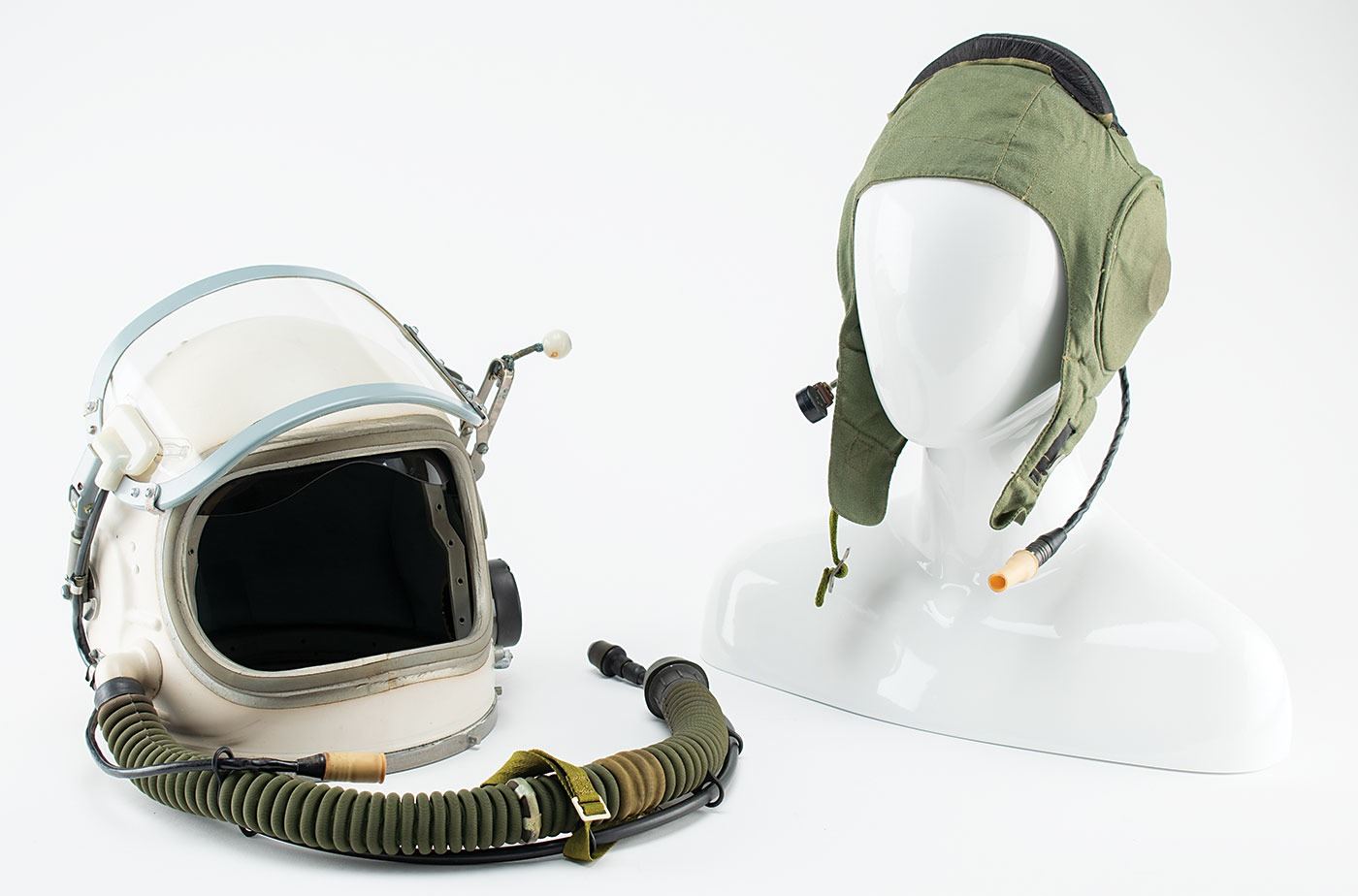 Circa 1980s Soviet ZSH-6 LP high-altitude pilot and cosmonaut helmet, as worn by Mig-25/Mig-31 pilots at altitudes over 70,000 feet and by cosmonauts during training. Includes the padded green communications liner—the Soviet counterpart to America's 'Snoopy cap'—with built-in microphone and headset. The white outer helmet is electrically heated and has an airtight sealed faceplate and shell. The green tube provides oxygen to the pilot, and the electrical cable is used for communications and power. The helmet has a metal neck ring used to connect directly to the pressure suit, ensuring an airtight seal. If the helmet or suit were to become depressurized at high altitude, the pilot would rapidly lose consciousness. Includes its original 'Passport' documentation, which states that this helmet was made in 1985 and was designed to be used for up to eight years. In fine condition.