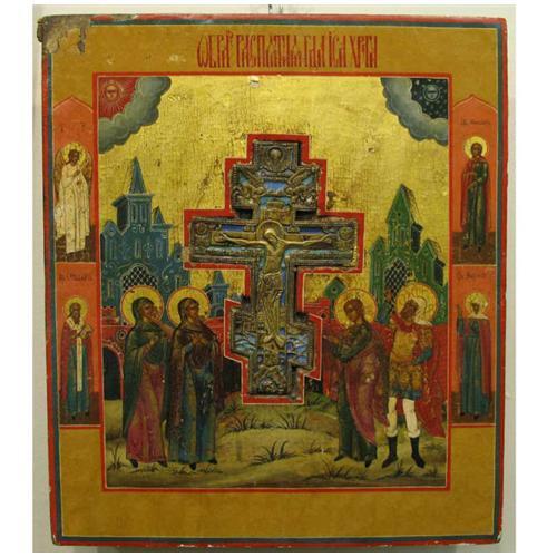 19th century, Ural Mountain, Egg tempera, gold leaf, gesso on wood panel. Bronze cross with three color of enamel is inserted in the middle.