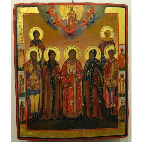 19th century, Center Russia. Egg tempera, gesso on wood panel. In full length shows glorious images: St. Martyr Nikita-Worrior, St. Martyr Grigoriy Pochaevskiy, St. Martyr Stefam, St. Aleksander Nevskiy, St. Georgiy-Victorious, on the back row: St. Martyr Varvara and St. Martyr Paraskeva Pyatniza. On the borders: left, Angel Custodian, St. Martyr Piter and St. Martyr Iosif, right, St. Martyr Tichon, St. Martyr Pavel and St. Martyr Tatiana.