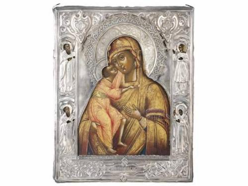 Egg tempera, gilt, with silver covering. Marked: Saint Petersburg, 1865, Mitin Alexandr Nikolajevics. Size: 22 x 17.5 cm