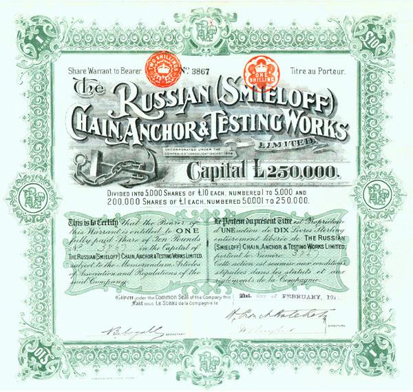 1911, Russia. Bond. Green/White. Top center vignette of an anchor and chain. Coupns below. Uncancelled and very fine.