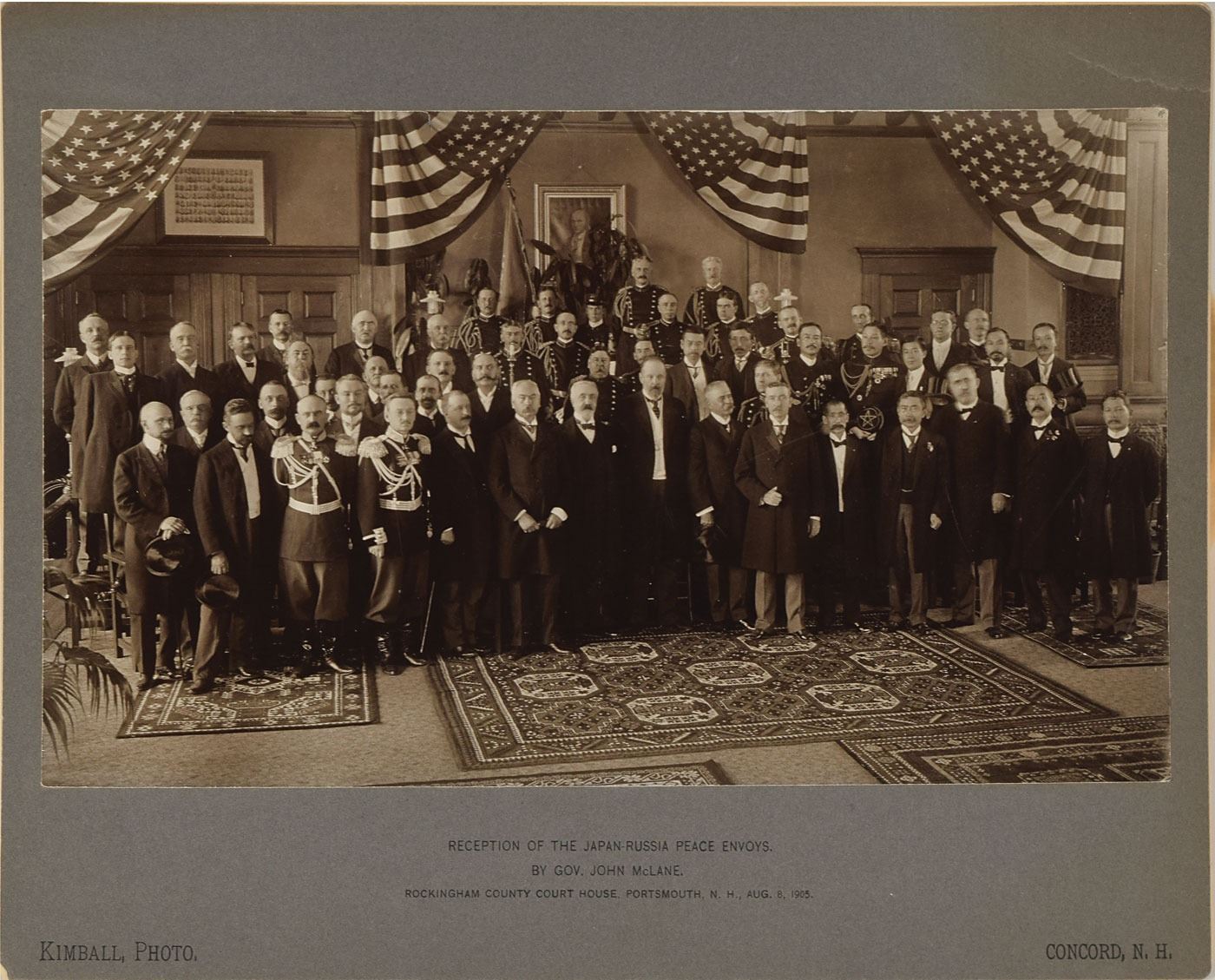 Offered with a smaller unsigned mounted silver print titled "Reception Of The Japan-Russia Peace Envoys. By Gov. John Mclane. Rockingham County Court House, Portsmouth, N.H. Aug. 8, 1905,” by Kimball, Concord, NH. The photo is accompanied by a printed key identifying the individuals photographed. In overall very good to fine condition, with toning and staining to the mounts.
