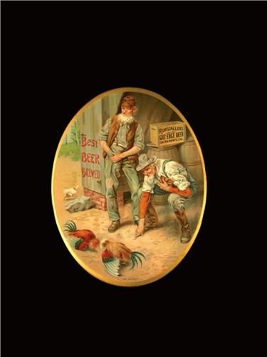 Rustallers Gilt Beer Edge Self Framed Tin Sign, entitled The Cock Fight, Sacramento, CA. 1912 copyright, American Art Works Lithographers, Coshocton, OH. Near mint condition. 20 1/4 X 24 1/2 inches.
