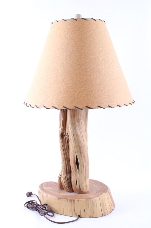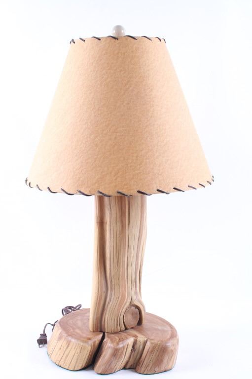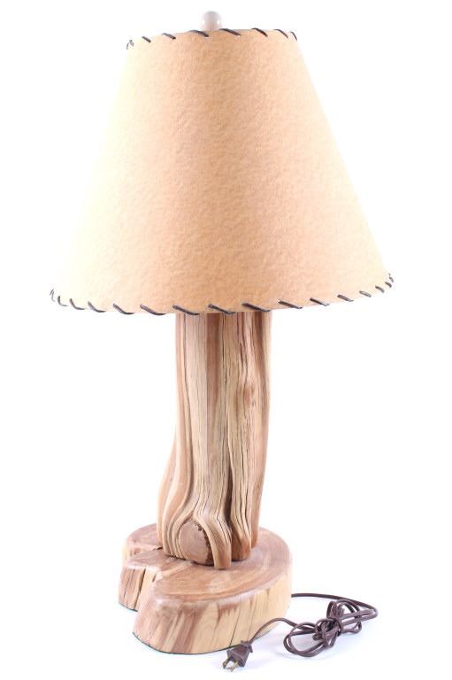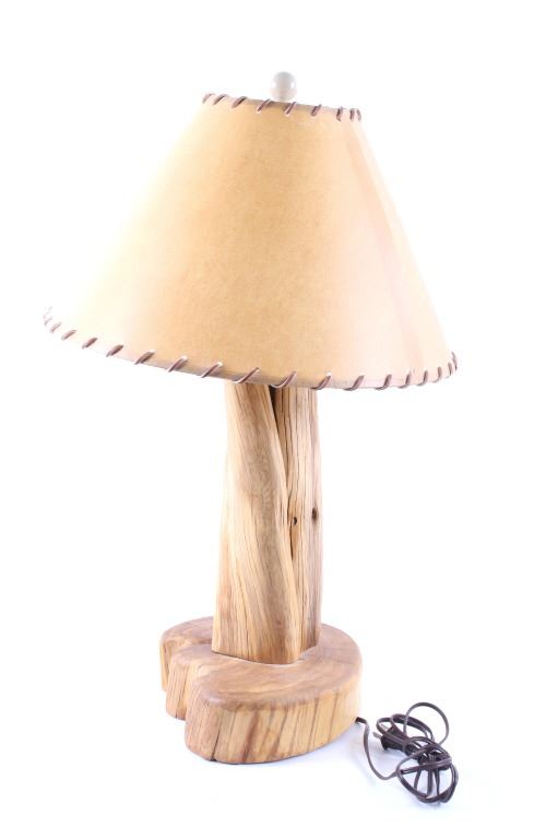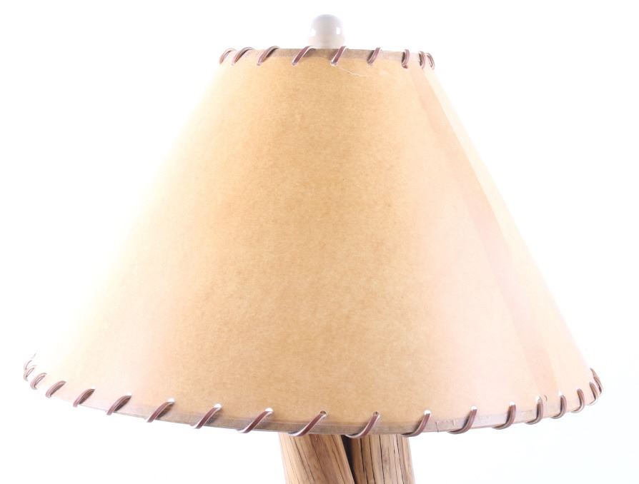 Featured in this lot we have a pair of rustic alligator juniper table lamps. The pair of lamps display alligator juniper construction with wonderful unique figure. The lamps show rustic tan lamp shades with leather accents. The lamps would make a wonderful edition to any western style home. The lamps show good condition overall with some light wear. The largest lamp measures 30 1/2" tall with the base measuring 12 1/2" by 9" and the shade measuring 16 1/2" diameter.