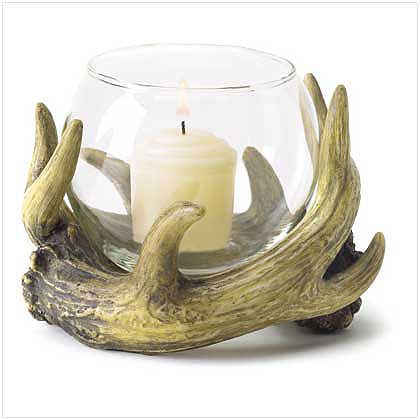 Rustic Antler Candleholder **|**|** Rustic Antler Candleholder Rustic antler" wreath forms a crafty cradle for a glass globe votive holder. A wonderfully woodsy touch of nature to warm up your cabin-style or country decor! Polystone with glass cup. Candle not included. 5 3/8" x 4 7/8" x 3 5/8" high. 1 EA (WFM-38444) Candles and Holders, Candle Holders