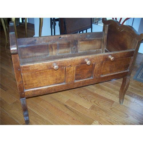 </font></strong>'Rustic' French Country Child's Crib, Solid French Walnut. It has 3 pegs on one side, and two pegs on the other. The middle one is missing from this side. There is fabric webbing attached to the bottom. There are slots for would slats that goes with the width. We found this piece in a Paris warehouse.</font>