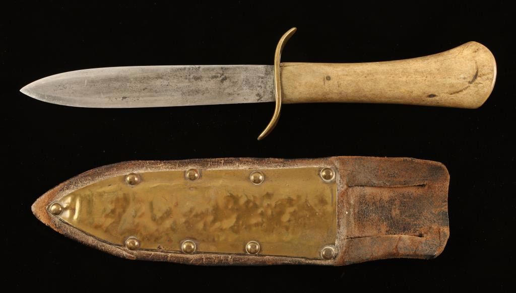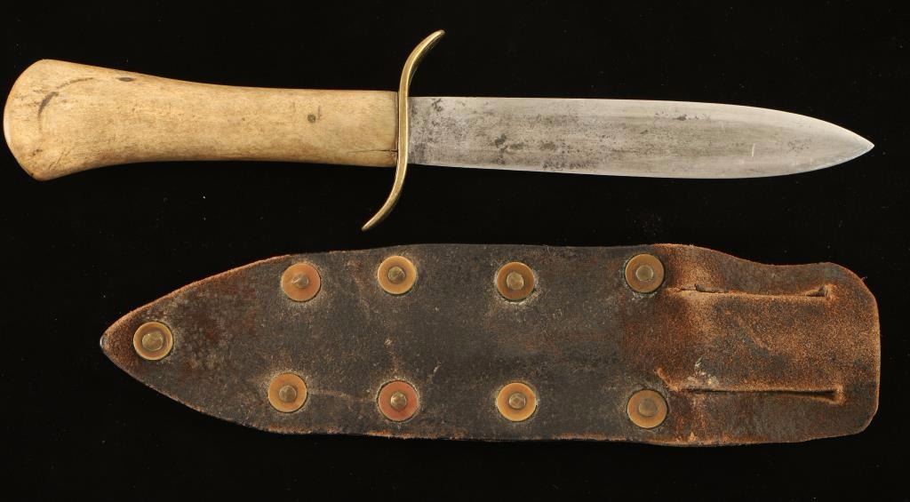 With smooth antler handle. Measures 11 1/2" overall with 6" blade. Includes a leather sheath which has a brass, handmade grommeted front.