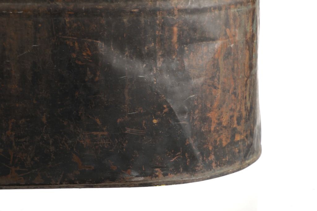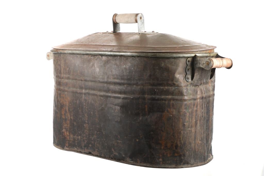 The boiler shows a wonderfully and professionally crafted copper construction with a two-handle design to the walls of the boiler and a lid that features a turned wooden handle. The condition of this boiler is fair, with wear and dents consistent with the age of the boiler and some scuff marks to the turned wooden handles.