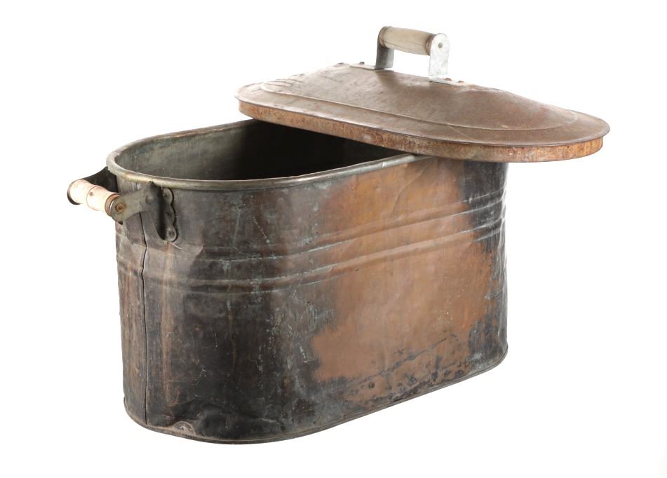 Featured in this lot is this Rustic Montana Copper Boiler Wash Tub with turned wooden handle lid, circa 1920's. Used for domestic laundry, linen and cotton were placed in the copper and were boiled to whiten them.