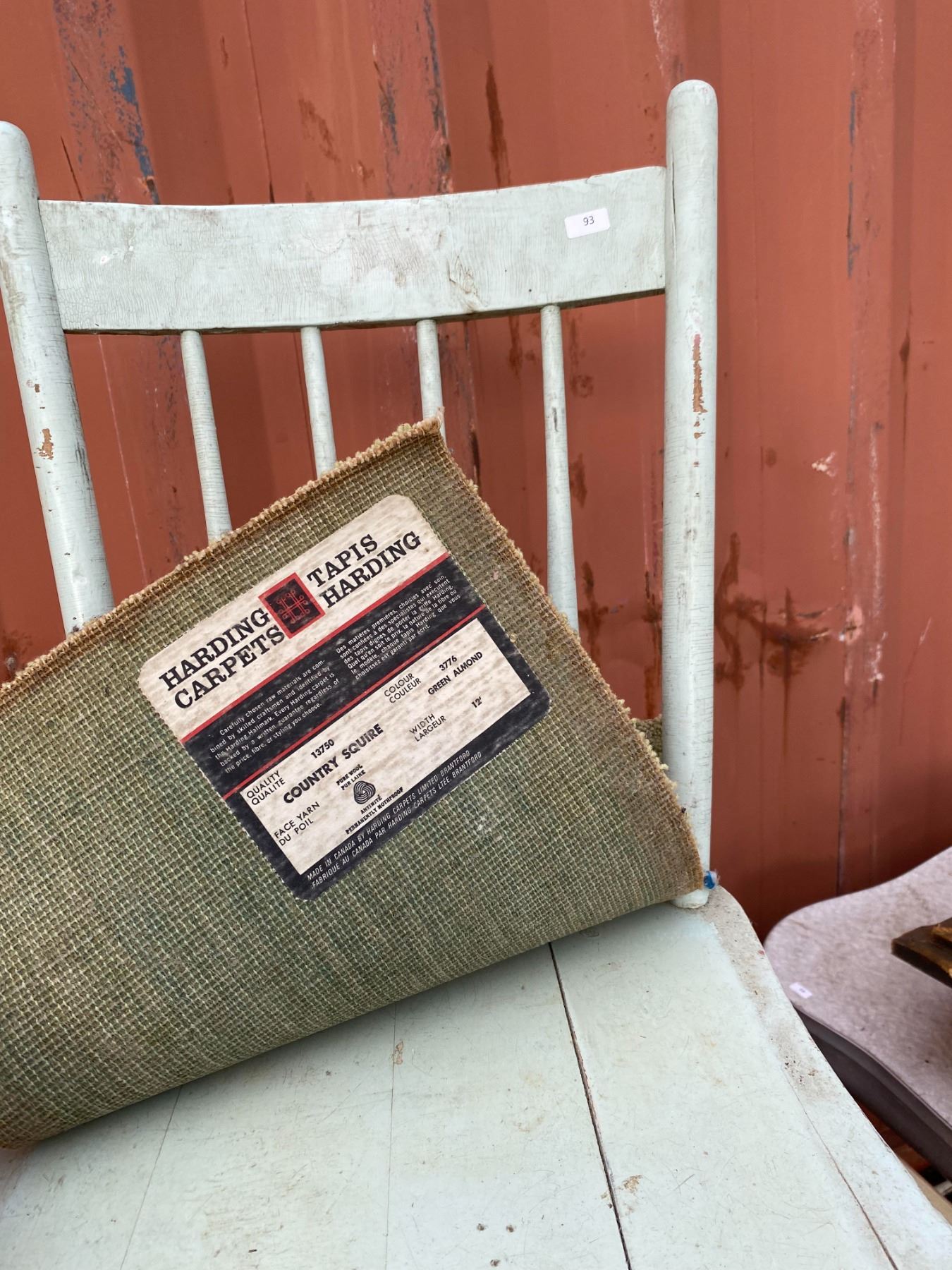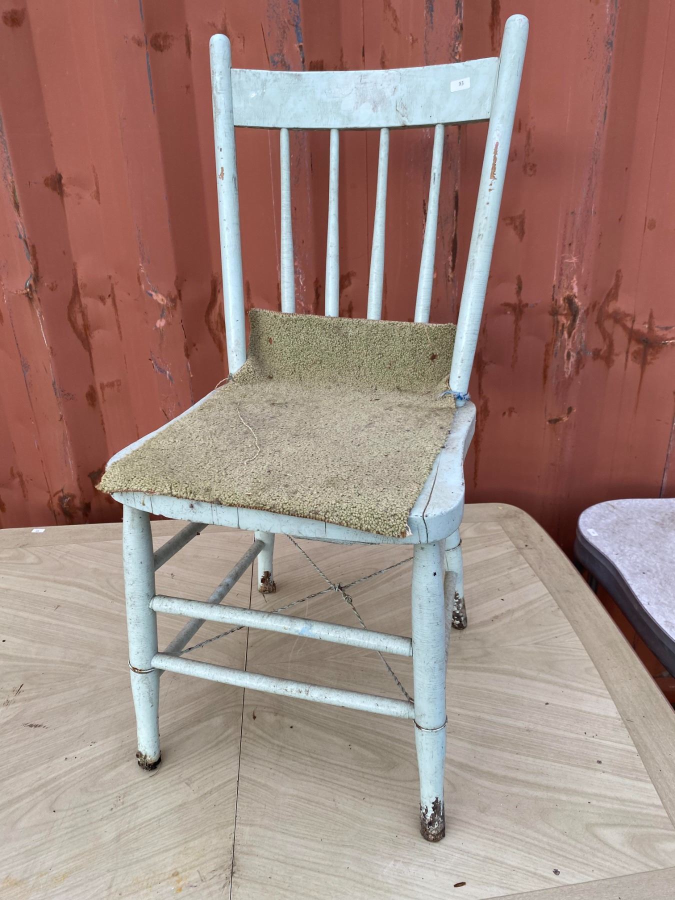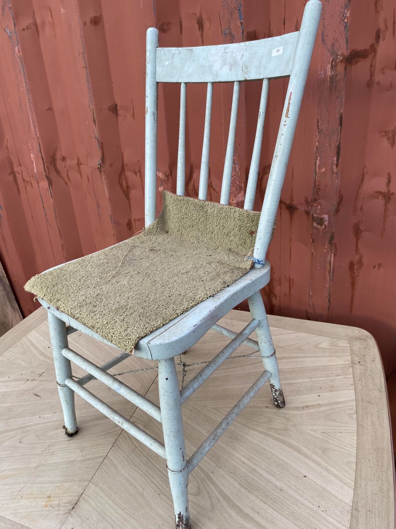 Charming rustic painted chair with spindle back and timeworn patina. Ideal for farmhouse decor, display, or a restoration project. Shows notable wear that enhances its vintage look.