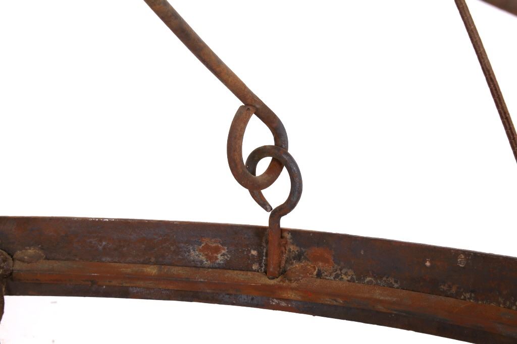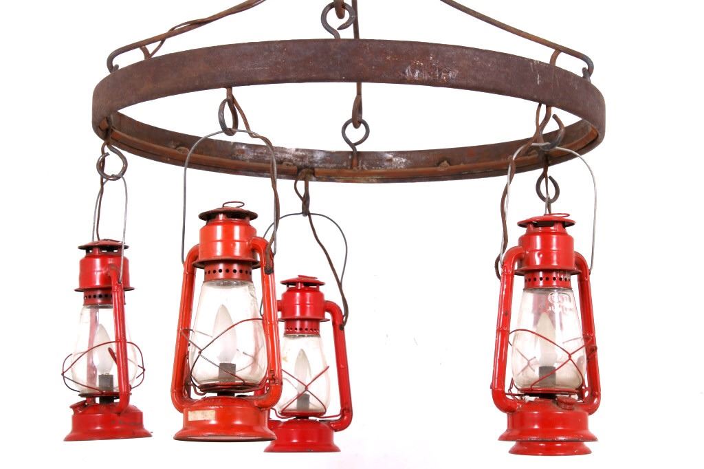 For your bidding pleasure is this Rustic Steel Wagon Tire & Dietz Lantern Chandelier. This chandelier set is comprised of an antique steel wagon wheel tire as a frame with five eyelets welded to it. From above the center of the frame are four bowed steel rods arching down to evenely spaced points on the frame and welded there to present the canopy of the chandelier. Attached the the eyelets on the frame are five Dietz No. 20 Junior lanterns all five of them are in good shape with little wear and tear to the integrity of the lanterns. The cord where the plug would be is frayed and needs repair. The measurements of the chandelier are 41" x 32 1/2" x 32 1/2".