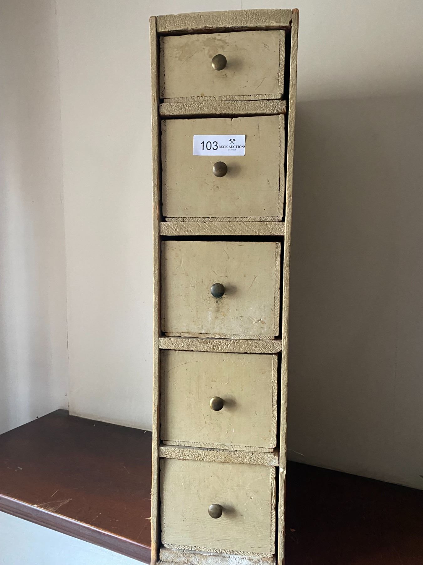 Five drawer narrow chest of drawers from the 1940's filled with little toys and trinkets