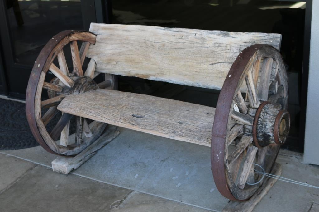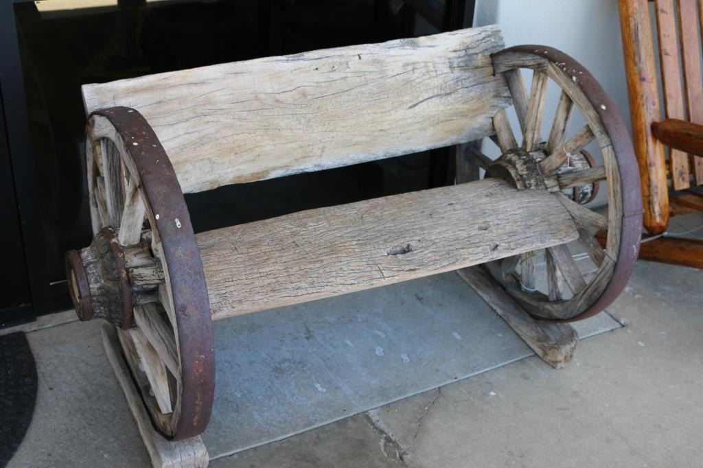 Tree trunk bench and back with wagon wheel sides. Measures 52" long by 31" tall by 29" deep. LOCAL PICKUP ONLY!