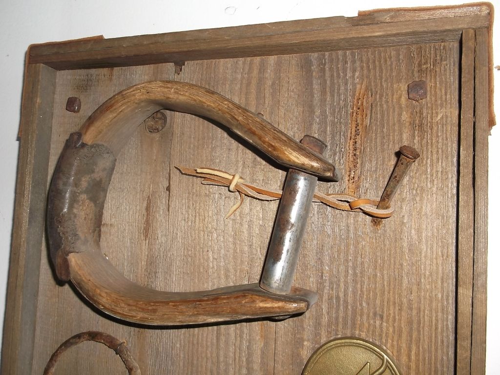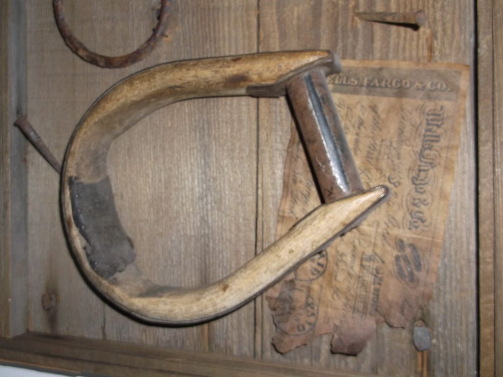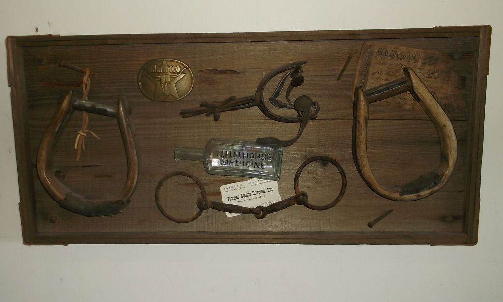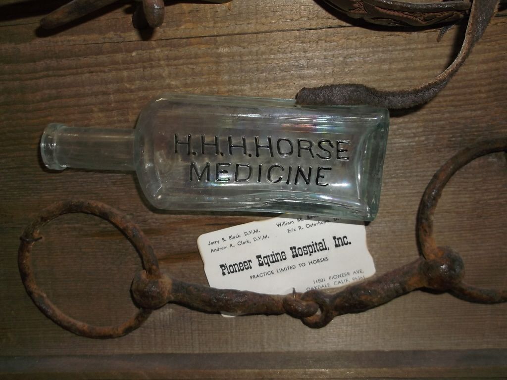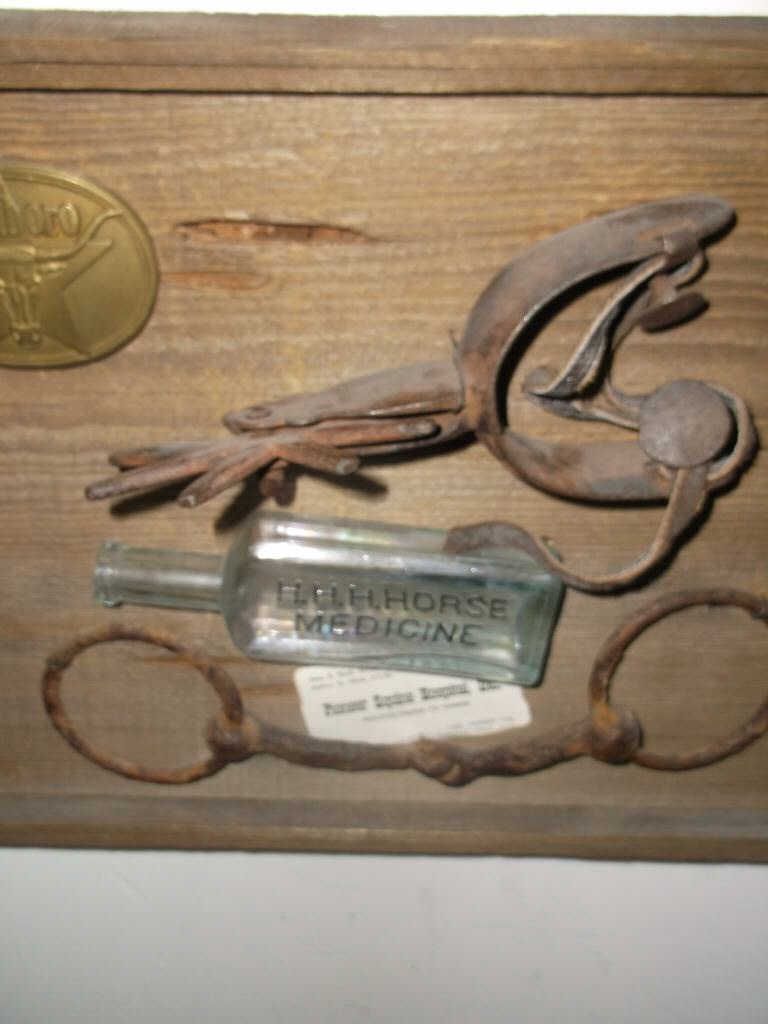 Horse medicine bottle, snaffle bit, ox bow stirrups
