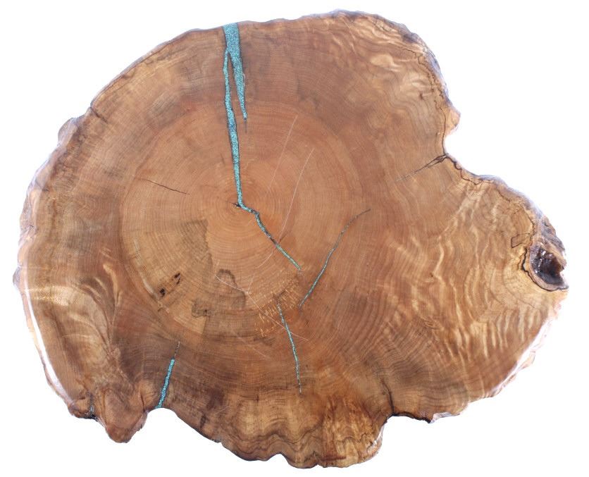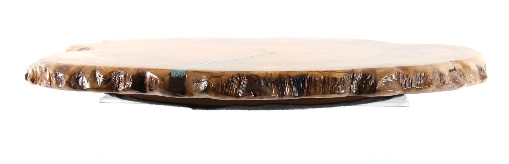 Available in this lot we have a rustic wood lazy Susan with turquoise inlay rotating serving tray. This lazy susan shows solid construction out of a section of tree trunk. The wood shows the core with rings radiating from the center and charactered outer edges. The top features four cracks in the wood that have been filled in with turquoise chip inlay. The piece shows good condition overall with some light wear across the top and smooth rotation. The lazy susan measures 19 1/2" at its widest by 1 1/2" tall.