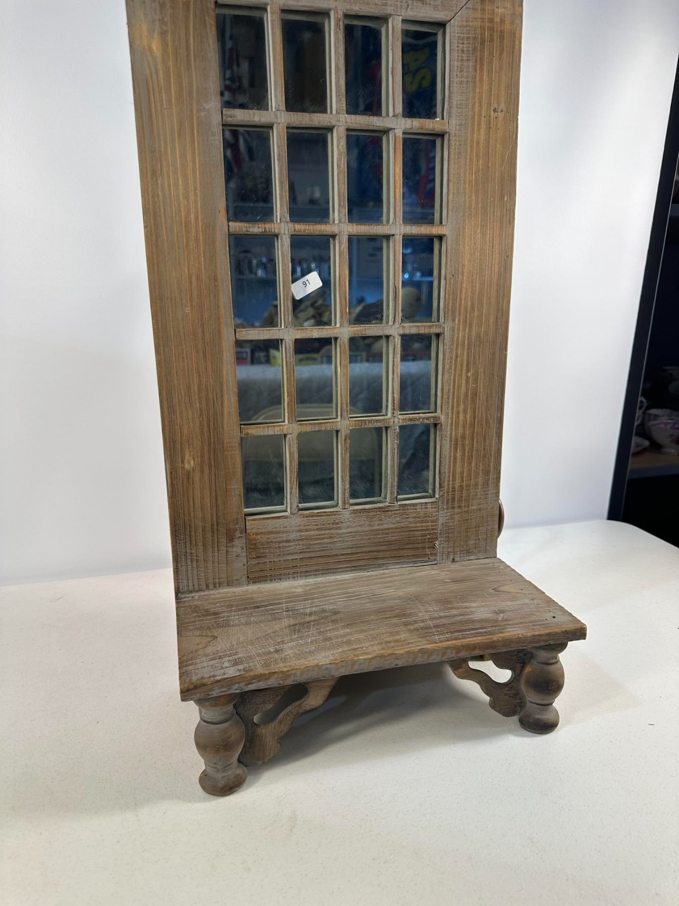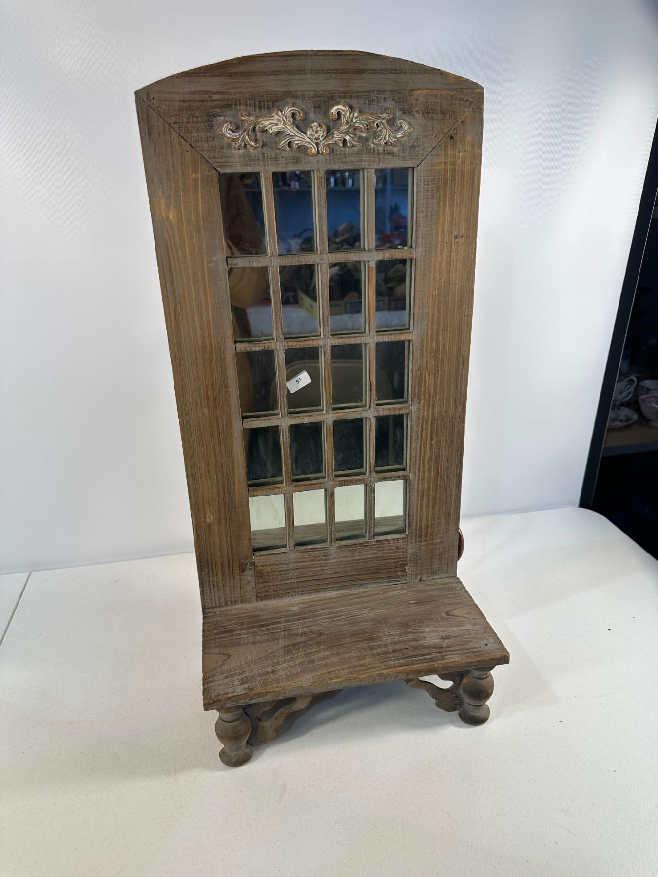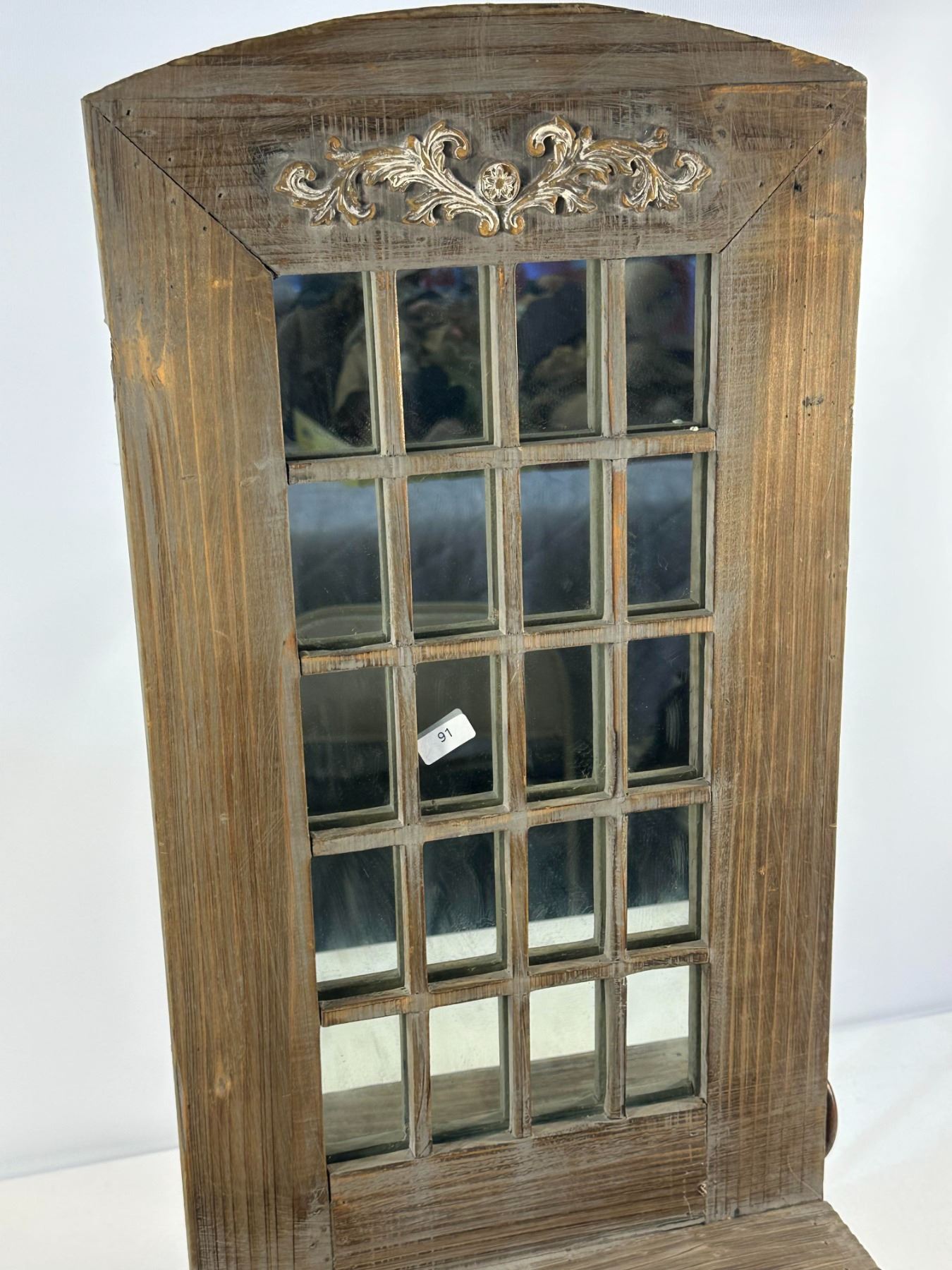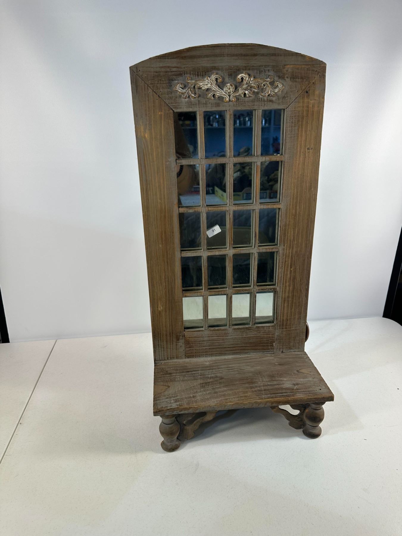 Charming rustic-style mirror featuring a multi-pane window design and carved floral crest detail. Includes a small integrated shelf with turned legs  perfect for entryways or farmhouse-inspired décor. Late 20th century. Natural distressed finish; solid and well-crafted.