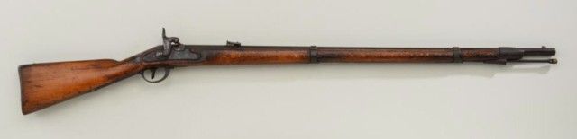 Rustic musket converted to percussion, .54 cal., 37” barrel, full stock, iron mountings and ramrod in overall uncleaned fair condition showing a heavy dark patina on metal surfaces and heavy pitting aroundfiring area; good action, dark bore, wood stock is overall good with scattered mars and some areas of old discoloration. Est.: $400-$800.