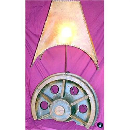 </font></strong>This spectacular huge floor lamp, is really a new device, but assembled with an antique train wheel wood mould , around 1890. It has been cleaned, polished and electrified, the hude shade was made with real natural leather, it stands 55 inches H, 31 inches wide and 23 inches D. SHipping within US $ 135</font>