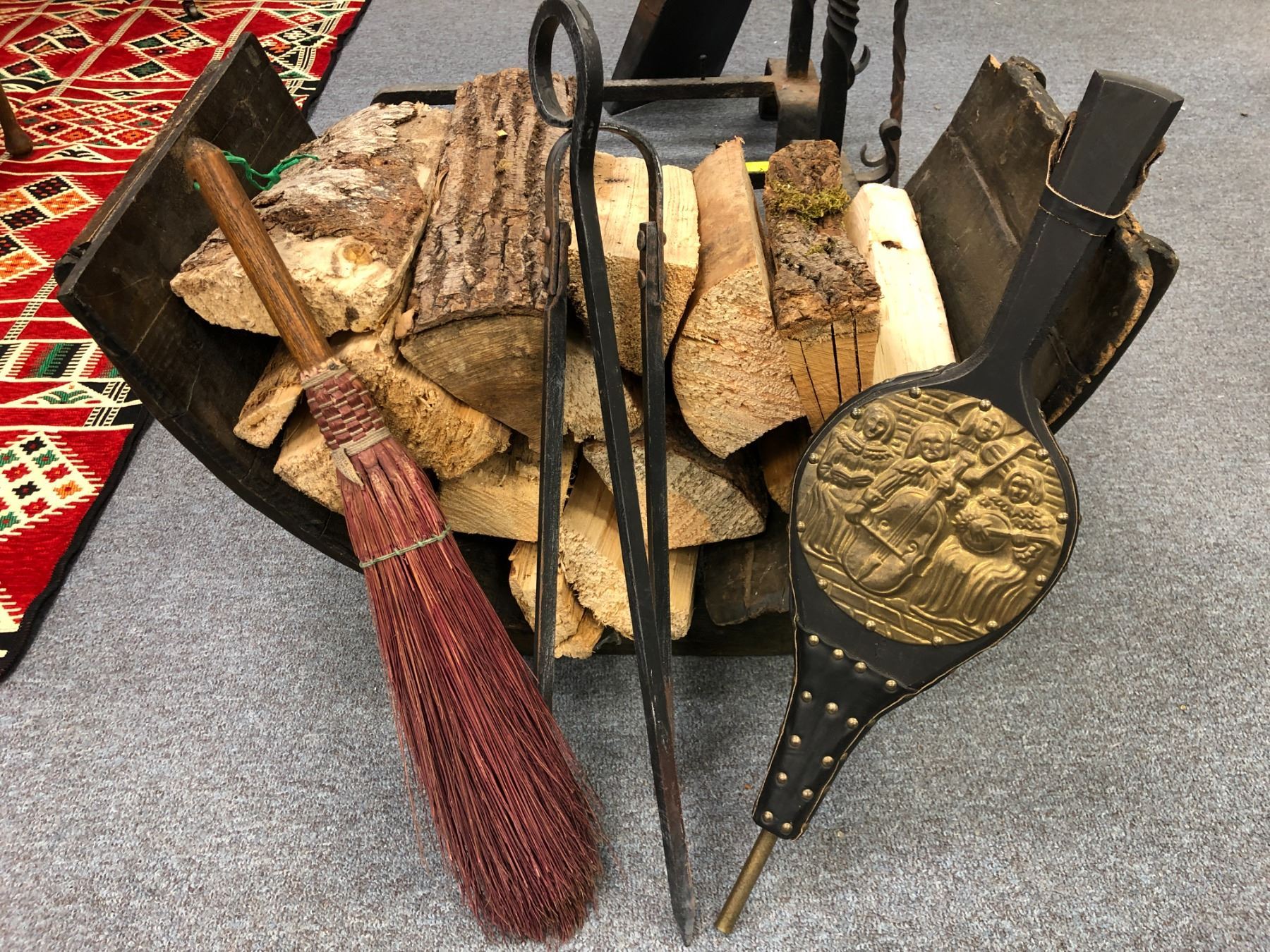 Rustic wooden fireplace log holder w/ 4 fireplace tools from movie set
