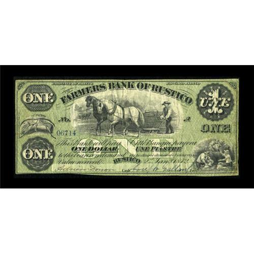 <B>Rustico, PEI- The Farmers Bank of Rustico</B></I> $1 Jan. 2, 1872 Ch. # 290-12-02<BR> This was the smallest bank (measured by share capital) ever to operate in Canada, and one with a most unusual history. As recounted in the Charlton reference, "This bank was established in 1862 and chartered by the Colonial Legislature of P.E.I. in 1863....By the Bank Act of 1871, Canada made a decision to do away with small, local branchless banks and adopt a policy of nationwide banking. Some banks were forced to sell out, but the Federal government found it difficult to put The Farmers Bank of Rustico out of business. It survived on frugality and devotion. After extreme pressures and delay, the bank managed to renew its charter in 1883 and almost unbelievably, again on June 24, 1891. But the pressure was on to put this bank out of existence. The terms of the last charter were so harsh and unrealistic that they rendered effective liquidation almost impossible. The bank was authorized to amalgamate with or sell its property to any loan company but wound up its operations around 1894." The example offered here carries the blue sheet numbers, and is one of the very highest grade examples known from this extremely rare institution. Sharp <B>Fine-Very Fine,</B></I> with excellent color and body for the grade. <BR><I>From The Thomas M. Flynn Collection</B></I><BR><BR><b>Shipping:</b> Coins & Currency (<a target="_blank" href="http://www.heritageauctions.com/common/shipping.php">view shipping information</a>)