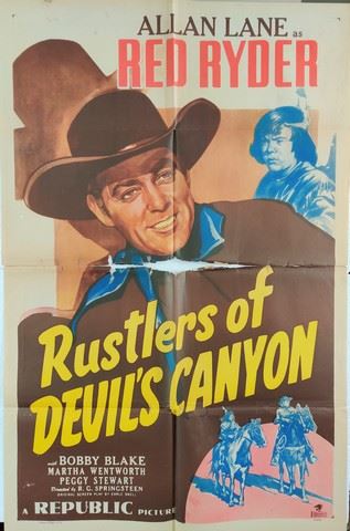 Rustlers of Devil's Canyon (Republic Pictures, 1947). One Sheet. Starring: Allan Lane. There are fold lines, creases, marks, stains, paper loss, pin holes, tape residue and edge wear damage. Poor. (27" X 41").