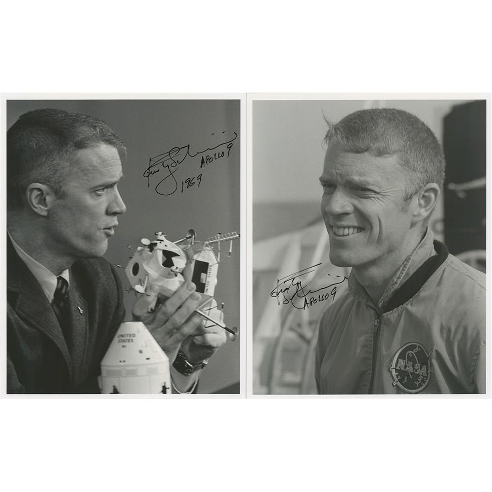 Two satin-finish 8 x 10 photos of Apollo 9 Lunar Module Pilot Rusty Schweickart, both signed in black felt tip, "Rusty Schweickart, Apollo 9," who adds "1969" to one. In overall very fine condition.